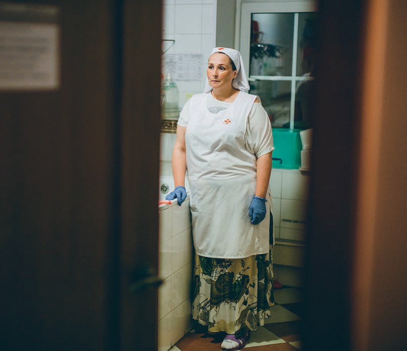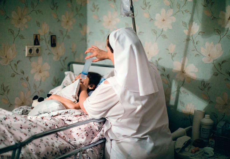 Сестра Светлана плачет за ширмой. Одновременно она набирает в шприц питание для Верочки, чтобы кормить ее через зонд, и поглядывает на большую икону Спиридона, висящую на стене. Наверное, молится ему, прося дать терпения в общении с журналистом.