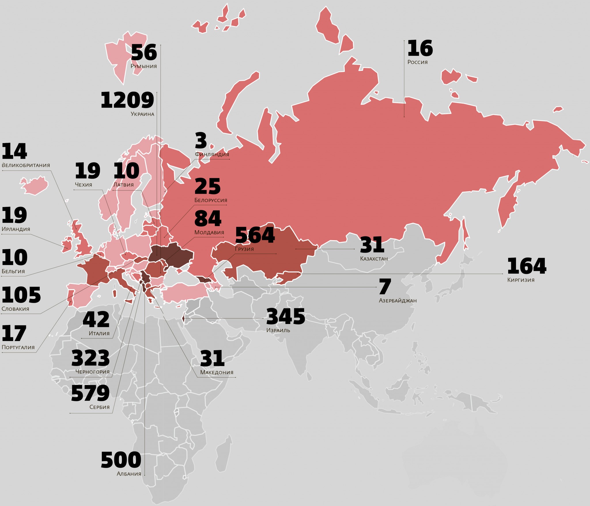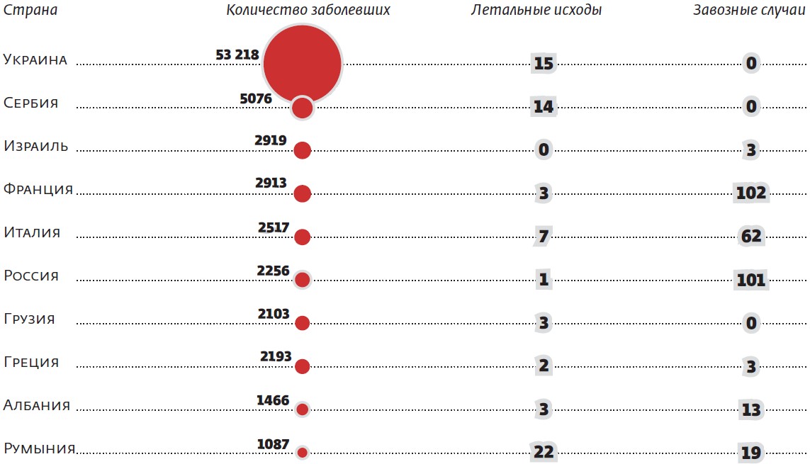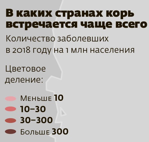 Лидеры среди стран, в которых вспышки кори переросли в настоящую эпидемию, — Украина, Сербия и Грузия. Более половины всех заболевших выявили на Украине, и здесь же корь встречается чаще всего — более тысячи случаев на миллион. Эпидемия продолжается.