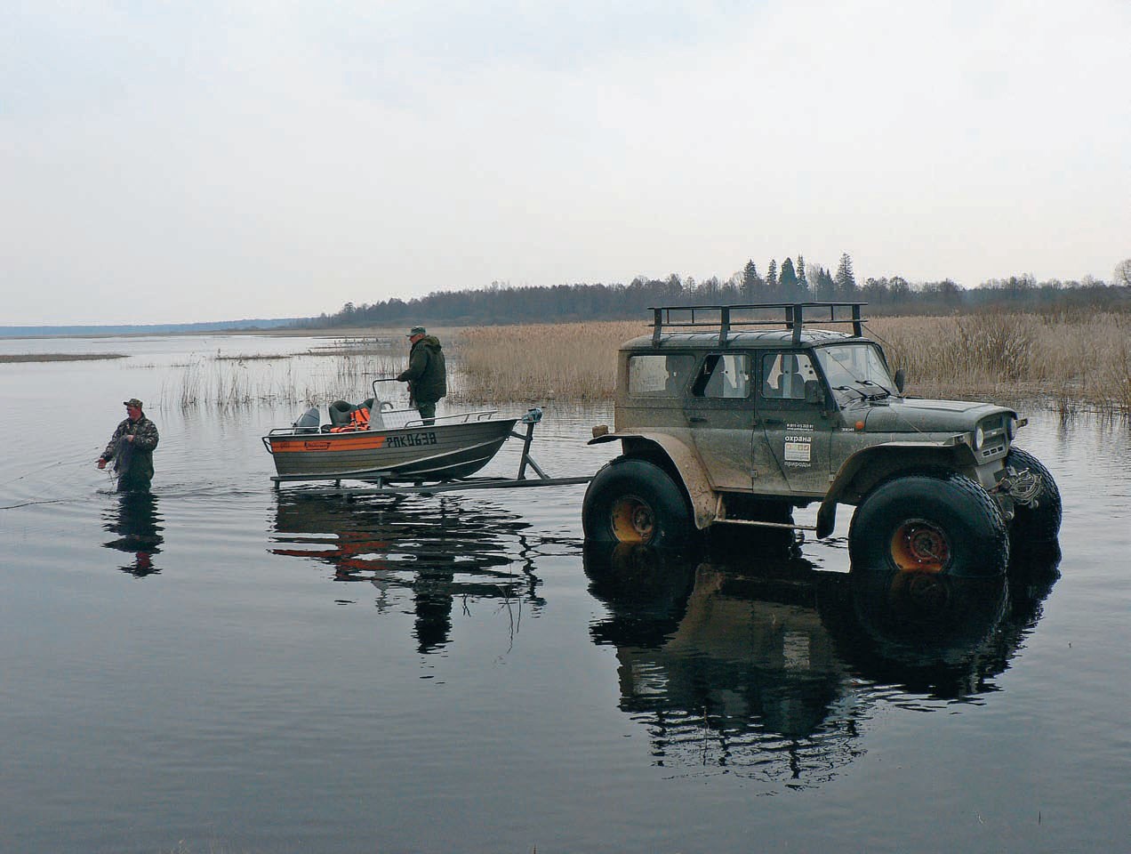 Мужчины грузят в моторную лодку наши вещи, а лодку грузят на прицеп, который крепят к болотоходу. Машина тащит лодку на заболоченный берег Цевловского озера.