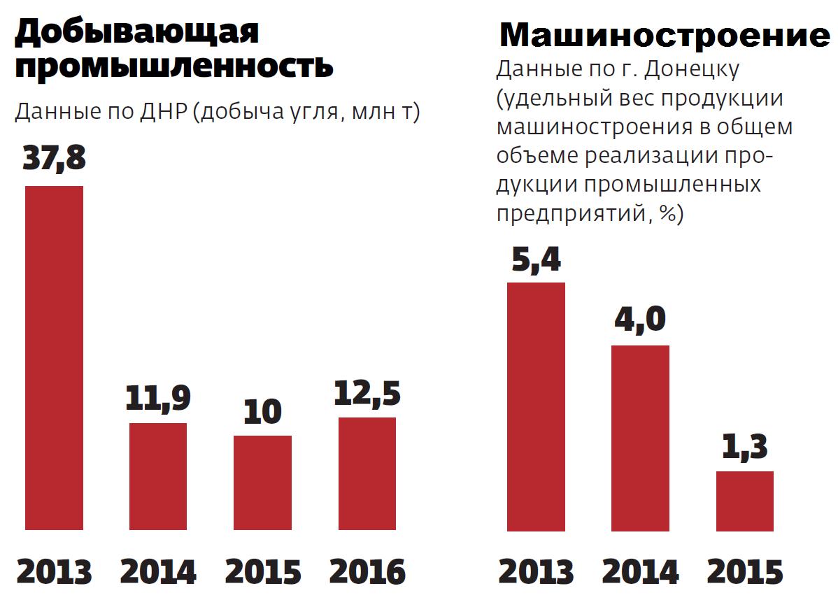 Так, например, добыча угля предприятиями ДНР в 2016 году выросла по сравнению с предыдущим годом на 25% и превысила показатели 2014-го. Это ключевой сектор экономики Донбасса, базовый индикатор. Металлургия, на которую приходится две трети всего промпроизводства республики, также потихоньку восстанавливается. В 2015 году после длительной консервации из-за активных боевых действий возобновили производство Донецкий и Енакиевский металлургические заводы. Планируемый запуск на полную мощность Юзовского метзавода, созданного на базе бывшего Донецкого электрометаллургического завода, позволит, как предполагается, ежемесячно выплавлять здесь около 30 тысяч тонн стали. Частичный запуск завода в прошлом году уже обеспечил прирост объемов производства в отрасли почти на 20%.