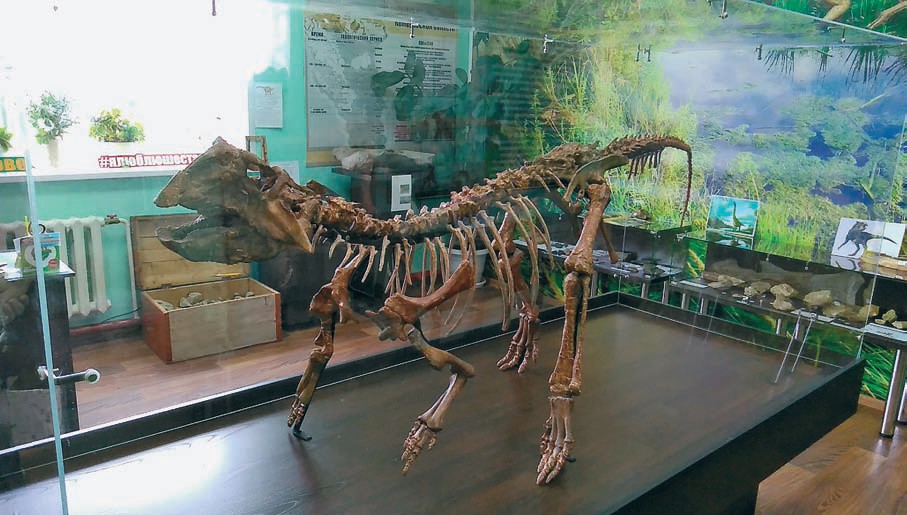 Музей небольшой, но выглядит не по-деревенски: экспонаты под стеклом, тематическая библиотека, конференц-зал с проектором и дружелюбный зеленый пситтакозавр из пластика, с которым можно сфотографироваться при входе.