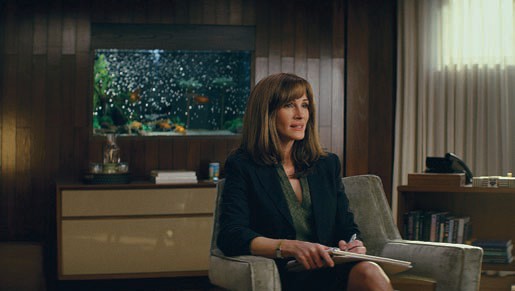 Робертс в нелепом наряде и парике играет то ли менеджера, то ли психиатра в экспериментальном центре адаптации демобилизовавшихся военных — этаком комфортном госпитале, где скучающих солдатиков пытаются подготовить к гражданской жизни с помощью сомнительной групповой психотерапии. При этом странного парня (шикарная роль Джереми Аллена Уайта из «Бесстыдников»), которому точно требуется помощь специалиста, довольно скоро выгоняют из центра за провинность, а вот уверенного и обаятельного умницу (Стивен Джеймс), меньше всех нуждающегося в терапии, оставляют. Периодически героине Робертс с каких-то очередных полей для гольфа названивает управляющий всей этой богадельней и напоминает, что главное в их работе — не терапия, а сбор данных.