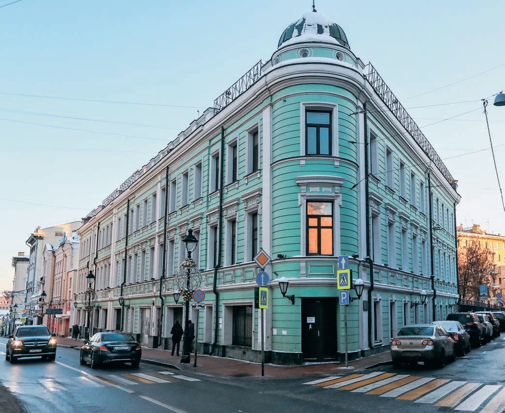 Когда-то здесь стояла аристократическая усадьба XVII века. В разные времена ею владели князья Мещерские и Ромодановские, графы Головкины. Необычный дом со скругленным углом по переулку был построен на месте переднего двора в 1830 году, когда усадьба перешла в руки купца Федора Булошникова, хлебопека и мецената. В тот год Москву накрыла эпидемия холеры. Булошников организовал бесплатное питание для бедняков в своей гостинице на Смоленском рынке.
