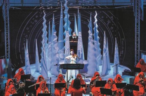«Но, будучи честным католиком, я хотел быть и честным ученым. И, удостоверившись, что Коперник был прав и что Земля действительно вертится вокруг Солнца, я уже не мог пойти на попятную», — Григорий Амосов, знаменитый математик и физик, превращает текст (его соавтор, кстати, — директор образовательных программ Политехнического музея Иван Боганцев) в музыку, вступая в дуэт со скрипкой, а вокруг него лесом вырастают белые конусы, по которым в финале побегут огненные сполохи. Красота мысли становится физически и визуально осязаемой, а маленький Электродвор превращается в башню из слоновой кости, где неважно, что оркестранты-инквизиторы в какой-то момент бьют молотками по деревянным дощечкам и рвут струны. Все равно ведь Земля вертится вокруг Солнца, а вера в науку, гармонию и себя оказывается сильнее всего.