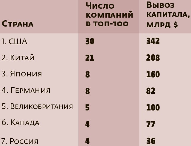 У всех транснациональных корпораций (ТНК) есть страны «прописки», но интересы их бизнеса охватывают весь земной шар, а степень влияния этих компаний на мировую экономику и на экономику конкретных стран напрямую зависит от того, сколько капитала они туда вывезли (то есть каков объем приобретенных ими активов, с которых они получают прибыль).