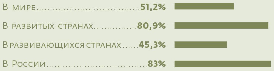 По данным Международного союза электросвязи, почти четыре миллиарда людей пользуются интернетом — это уже больше половины населения планеты. Но по-прежнему очень велико «цифровое неравенство» в возможностях доступа к Сети между жителями развитых и развивающихся стран. Россия по доле пользователей Сети и их активности оказалась впереди планеты всей: у нас 69% взрослых пользуются интернетом каждый день. Доля пользователей Сети среди всех взрослых: