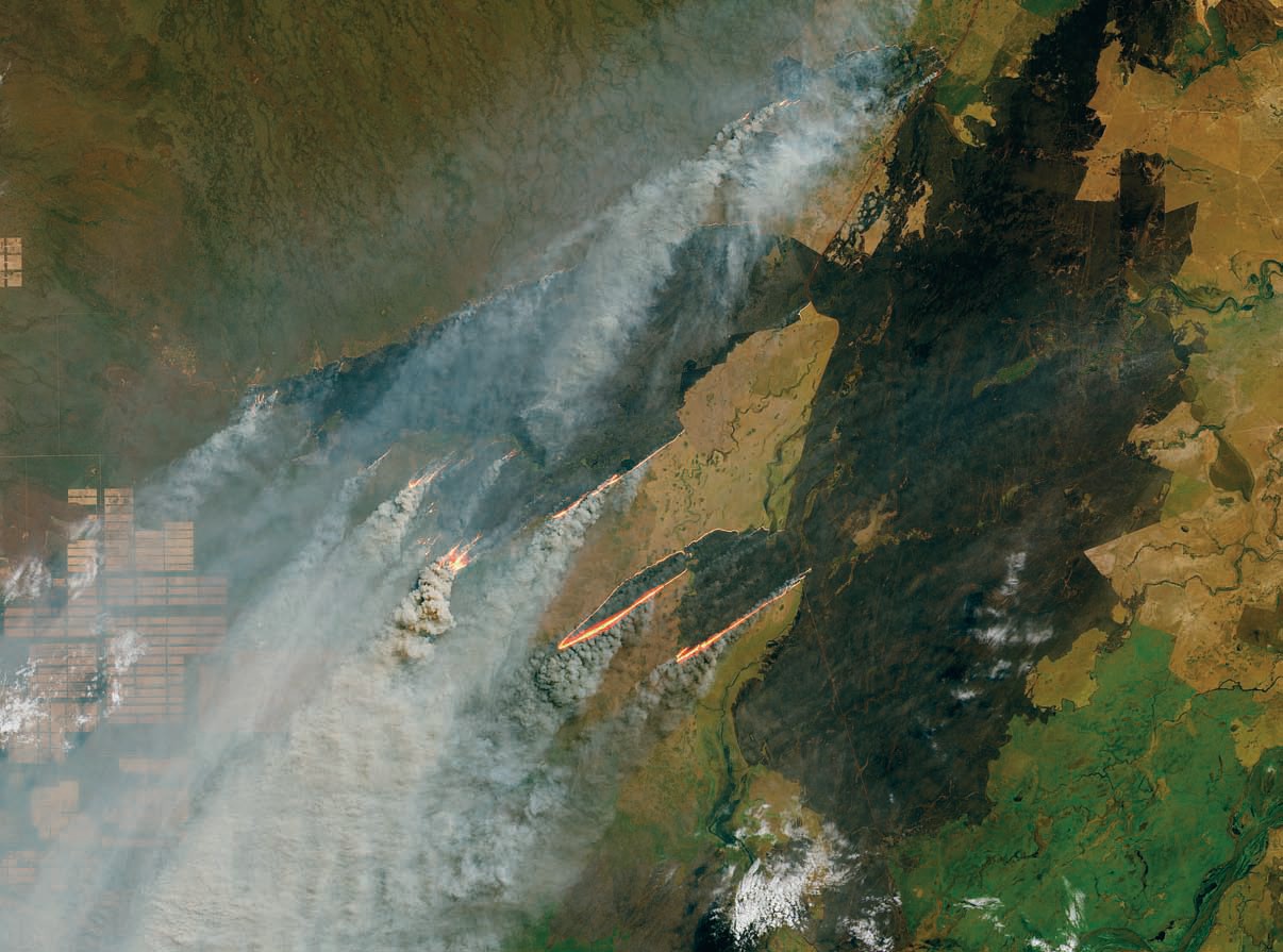 На фото, снятом со спутника, — лесные пожары к северу от реки Парагвай. Вслед за Сибирью и долиной реки Конго рекордные пожары охватили территорию Южной Америки. Стихия уже уничтожила свыше 2 млн гектаров леса, больше всего — в амазонских джунглях. Для того чтобы отслеживать распространение огня, ученые используют инфракрасные объективы спутников.
