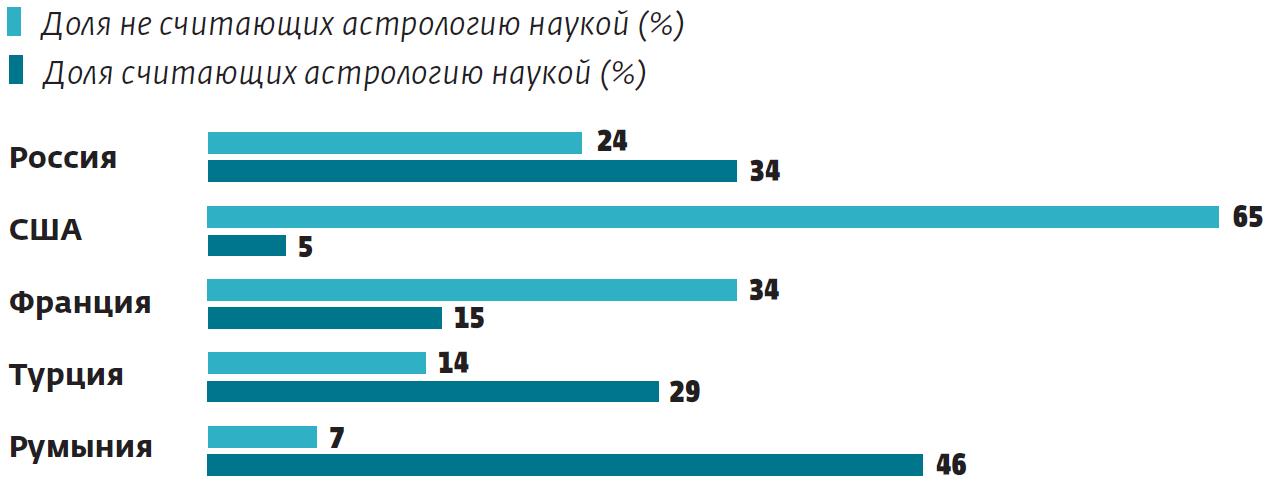 Лишь четверть россиян однозначно отвечает, что астрология не является наукой, но в 2006 году их было еще меньше — лишь 18%. По данным международного исследования Science and Engineering Indicators, Россия оказалась на 15-м месте среди 34 западных стран, проводивших опрос. Оказалось, что астрология особенно популярна во всех странах бывшего социалистического лагеря — именно здесь доля верящих в научность астрологии в два-три и более раз превышает долю тех, кто воспринимает ее как заблуждение.