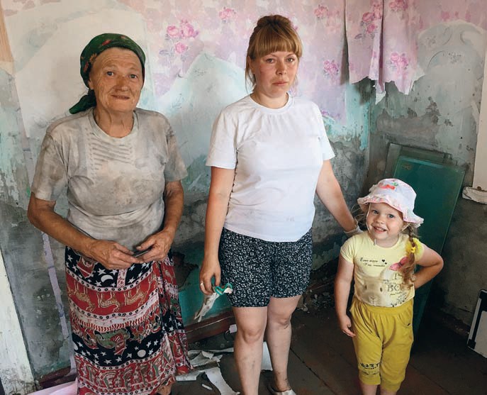 — А там уже вода шуршала и бурлила, — Ольга показывает за стену дома. — А потом чужие дома мимо пошли. И они все бились об наш дом. Рядом у нас дом из такого кругляка стоял, мы молились, чтобы он не сошел и нас не ударил. Один дом прошел ударился, второй, сайка прошла, баня, третий дом прошел… Мы сидели на крыше и слушали скрежет домов.
