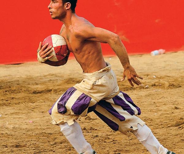 Флорентийский футбол — один из самых древних предков современного футбола. Во Флоренции в него играют с XVI века, хотя корни этого вида спорта уходят еще в античные времена гладиаторских боев. Правила предельно просты — надо забить мяч в ворота соперников. Игра больше напоминает смесь греко-римской борьбы и регби, нежели современный футбол. Традиция стала активно возрождаться со второй половины XX века. Четыре команды — белые, красные, синие и зеленые — играют два полуфинала, а финал проходит 24 июня, в день покровителя Флоренции — Сан-Джованни.