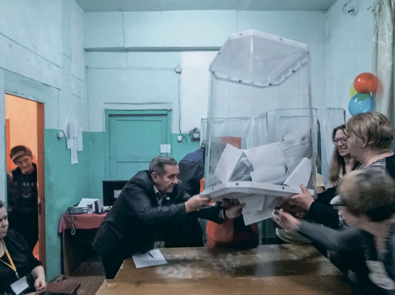 На крыльце администрации поселка Силач колдуют два молодых парня. Они устанавливают динамик, выбирают трек в ноутбуке — и вот, перекрывая все, звучит The No Smoking Orchestra Эмира Кустурицы, придавая происходящему вид фарса. Тут есть все: деревянное крыльцо, поленница с дровами, флаг и великолепная природа — все происходит в прямой видимости от Аракульских Шиханов, продолжения Уральского горного хребта, которые, говорят, на 50 миллионов лет старше швейцарских Альп. В поселке Силач к двенадцати часам дня явка почти 80 процентов.