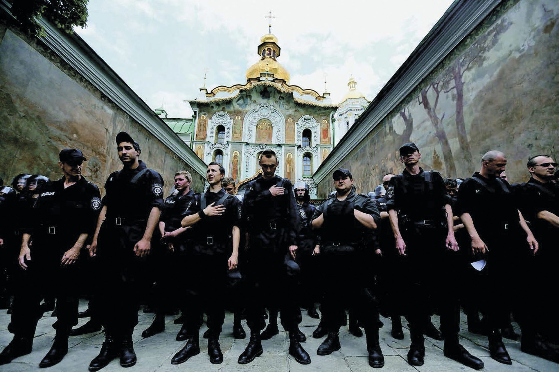 всех сторон сбегаются прихожане Лавры. Они поют вместе с монахами, разделенные подъездными воротами. Час длится противостояние голосов, молитвы и лозунгов. Через час толпа в камуфляже внезапно уходит. Монахи еще поют за воротами, в их голосах слышится удивление, какое появляется, когда ты ждешь худшего и уже находишься на пике обстоятельств, подтверждающих: худшее вот-вот случится, — но гроза рассеивается. Прихожане расходятся. Через некоторое время голоса за воротами затихают.