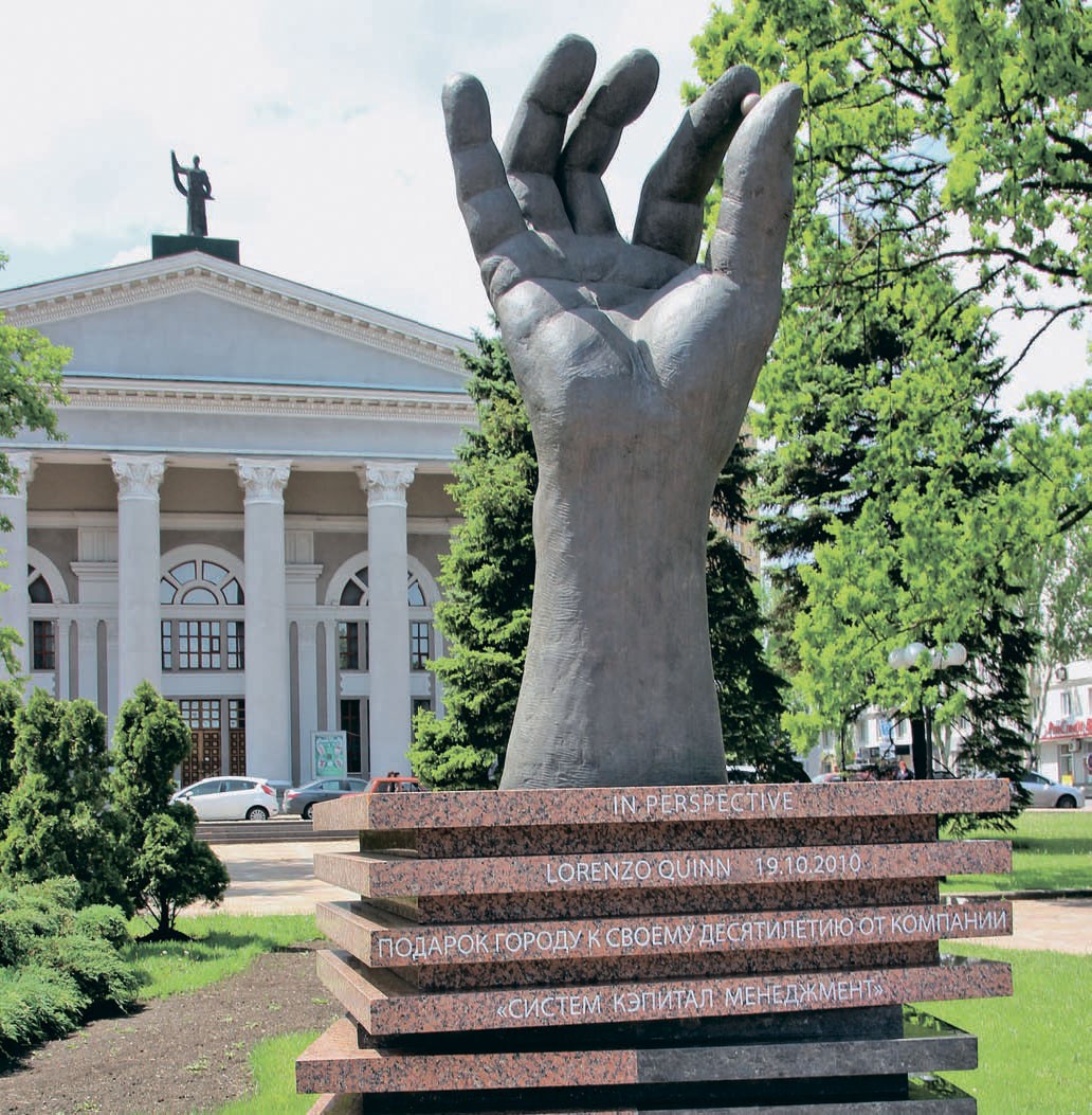 Каменная скульптура называлась «В перспективе». Ее автор — известный итальянский скульптор Лоренцо Куинн, провозгласивший себя человеком мира. Он создал серию скульптур за мир во всем мире и одну из них в 2010 году подарил Донецку.