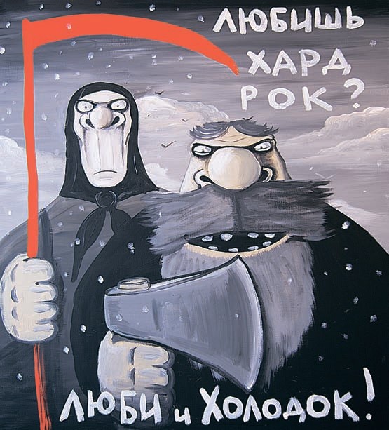 — Ну, вот, и вы туда же – интерпретируете. Просто человек. Но мы понимаем, что это именно зло, что он уже через край перешёл. Но в отличие, допустим, от питерских «Колдовских художников», моих друзей, я не занимаюсь осуждением. Я не говорю, это плохо, а то хорошо. Если я что-то рисую ужасное, — ну, как ужасное, ужасное с точки зрения зрителя, — какого-нибудь пьяного, то я им, скорее, восхищаюсь, даже воспеваю его, как Венедикт Ерофеев. А ещё ставлю себя на место персонажей очень часто.