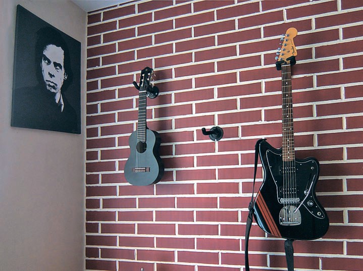 Там комната, где он творит музыку, я же каким-то образом музыкант, поясняет. Портреты — соответствующие: Ник Кейв, Том Уэйтс, Егор Летов. Рядом и небольшая коллекция гитар. Вот — Fender Jazzmaster, его фаворитка. А вот — ручной работы, называется сигар-бокс, корневая, негритянская штука, коробка от сигар, черенок от лопаты, на таких играют блюзовые музыканты, «Кроссроудз», например. Вася берёт её в руки, с удовольствием извлекает «уэуэууу».