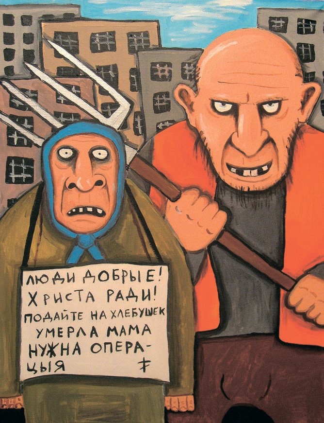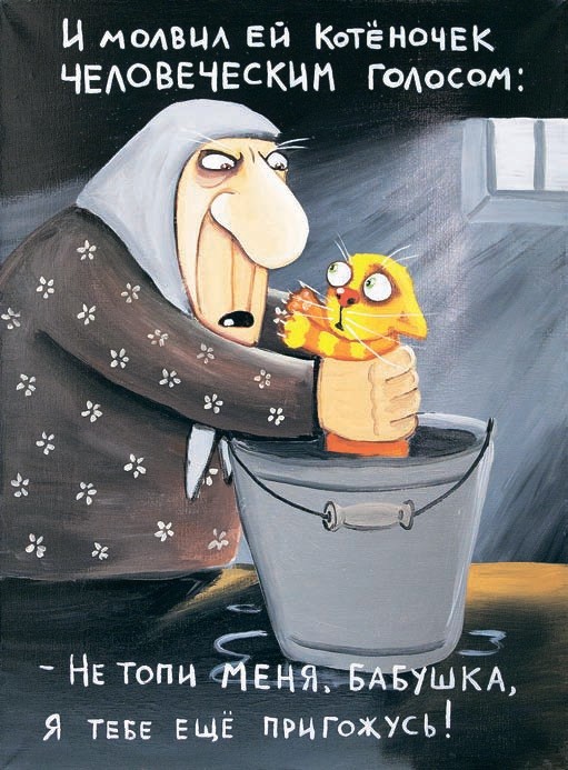 — Скорее, с комиксом. Есть свои герои, иерархия, пересечения. От лубка я просто оттолкнулся. В детстве у меня была кружка, на ней две тётки разговаривают — красивая ярмарочная сценка и надпись. Вот, человек торговал овощами, потом едет домой, и на дорожку какую-то картинку веселенькую прикупает. Здесь примерно так же. И даже не комикс, а путешествие. У меня же персонажи из картины в картину перепрыгивают. Я люблю медведей рисовать, которые издеваются над клоуном. Или старух безумных, которые подключились к Интернету и прочитали там что-то такое, что полностью изменило их мировоззрение.