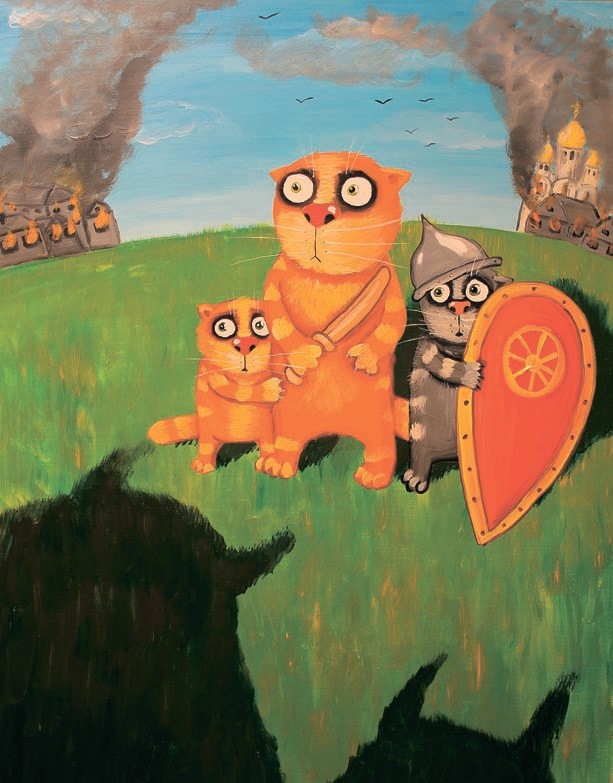 — Допустим, есть у меня картина «Деревянная сабелька», самая дорогая из проданных. Она — суперсерьёзная. Там о том, что всех убили, остались только детки, вышли они сражаться с врагами, а у них в руках из оружия только одна игрушечная сабелька. И эта картина показывает и то, что им уже капец, но и то, что они уже заранее победили, потому что от них свет этот исходит.