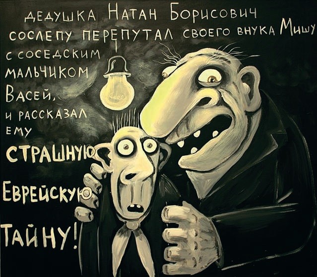 — Меня часто принимают. Это вообще — тема. У меня есть картина про это: «Дедушка Натан Борисович сослепу перепутал своего внука Мишу с соседским мальчиком Васей и рассказал ему Страшную Еврейскую Тайну». Откуда возникло? Я приехал в гости на Пушкинскую, центр Москвы. Сели за круглый стол, вот как у меня. Ля-ля-тополя, разговоры разговариваем. И начинается у них беседа какая-то за еврейскую историю. И обращаются они ко мне так, будто я тоже еврей. А я по стенам-то гляжу: а там эти меноры. Тогда я им и говорю: «Ребята, я дико извиняюсь, но я не еврей, даже близко». Они: «Чего, правда?! Не может быть. Ты же наш».