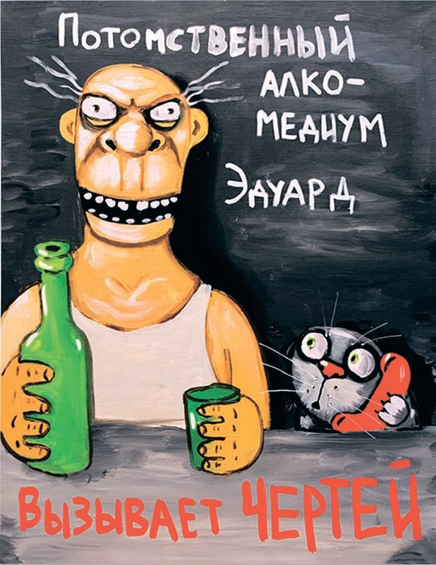 — Вот на ум пришла моя картина: «Потомственный алкомедиум Эдуард вызывает чертей». Там сидит человек за столом с бутылкой и вызывает чертей. А кто-то скажет: «Ты же эдак видишь всех русских, народ наш – пьяный, охреневший». Каких ещё русских, говорю, я нарисовал весёлую картинку про конкретного Эдуарда, которого знаю лично.