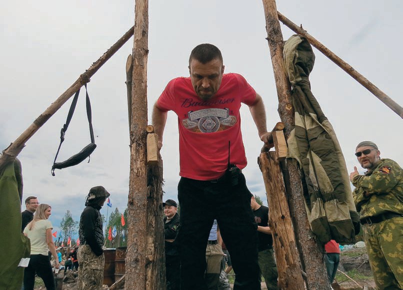 На турнике в красной футболке с надписью «Родившийся в СССР», в облаке комаров, на них не реагируя, мощно подтягивается Антон Кисляков — лагереобразующая личность. Недавно только снял гипс с ног — сломался не здесь, по другому делу. Приехав в Шиес на костылях, многих вдохновил своей отвагой.