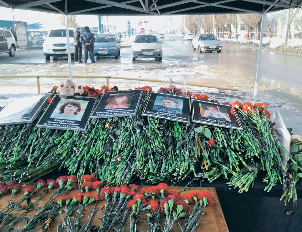 Вот там, на кухне суетилась, наверное, пожилая Людмила Власова. В той спальне Виктория Ларикова, на ночь глядя, возможно, сидела за компьютером в соцсетях. А в той комнате, похоже, собиралась за ужином семья Пашутиных — родители и двадцатичетырехлетняя дочь, симпатичная очень. Всех их, пятерых погибших, фотографии можно увидеть недалеко, около заправки, — только дорогу перейти. Там, в открытой и шаткой на ветру палатке, придумали наспех временный мемориал: на горке гвоздик лежат в ряд портреты. Там же служили панихиду. Палатка выглядит обособленно, никого из прохожих не привлекает, и будто не относится к пострадавшему дому. Издали кажется, что это цветы продают.
