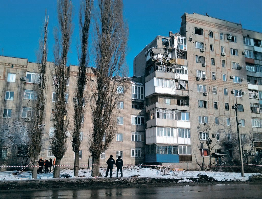 Четыре квартиры на восьмом и девятом этажах разрушены полностью; те, что рядом, повреждены. В соседних пятиэтажках кое-где выбиты стекла. Еще можно разглядеть какие-то приметы — предметы нехитрой обстановки, свидетельства жизни, в общем-то, беззаботной, как теперь получается. Полотенца, трепещущие как белые, признавшие поражение флаги, балконный скарб.