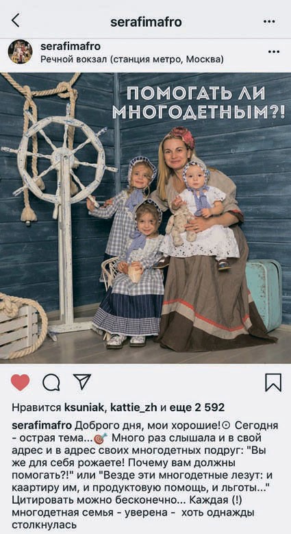 «Моя жизнь далеко не радужная, и то, что человек выхватывает внешне на картинках моего блога, конечно же, не может дать даже приблизительного представления обо мне, но те подписчики, которые со мной давно и которые читают мои посты (не только смотрят картинки), — они в курсе нашей непростой ситуации. Это не значит, что я пытаюсь вызвать к себе жалость и жду помощи — это не так! Мне для себя просить что-то сложно, вернее, очень сложно, я скорее попрошу для других. Меня вот даже выгнали, совсем недавно, из православной благотворительной организации, которая находится при нашем храме, и руководитель этой организации сказала, что я непохожа на нуждающуюся и мои дети тоже: мы слишком прилично одеты, что многодетные одинаковую одежду не носят, а только то, что достанется, и, конечно же, что у меня очень красивый блог, я прекрасно выгляжу и помощь мне не нужна»