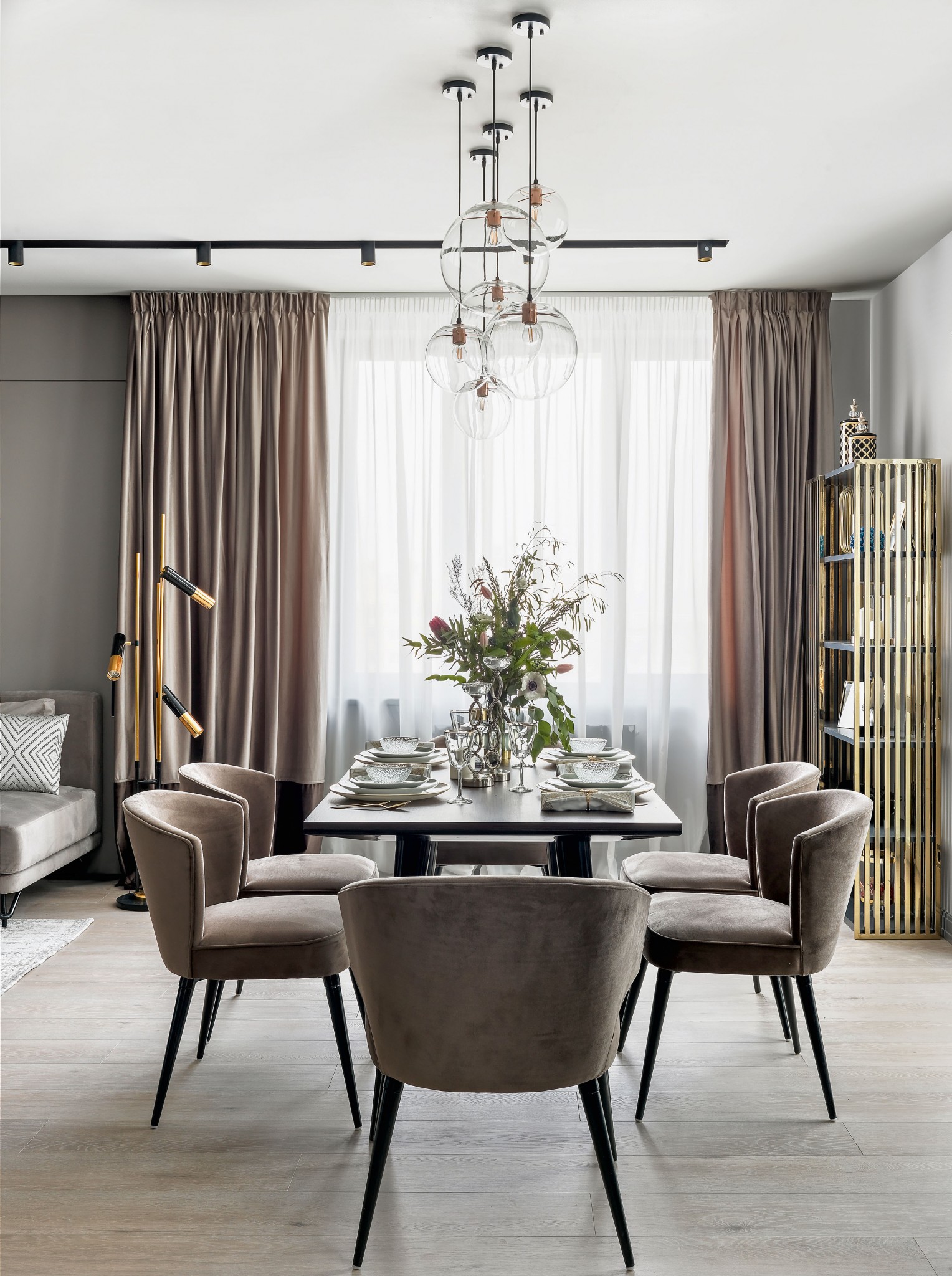 Столовая зона. Подвесной светильник, Selene. Обеденный стол, стулья выполнены по эскизам дизайнеров