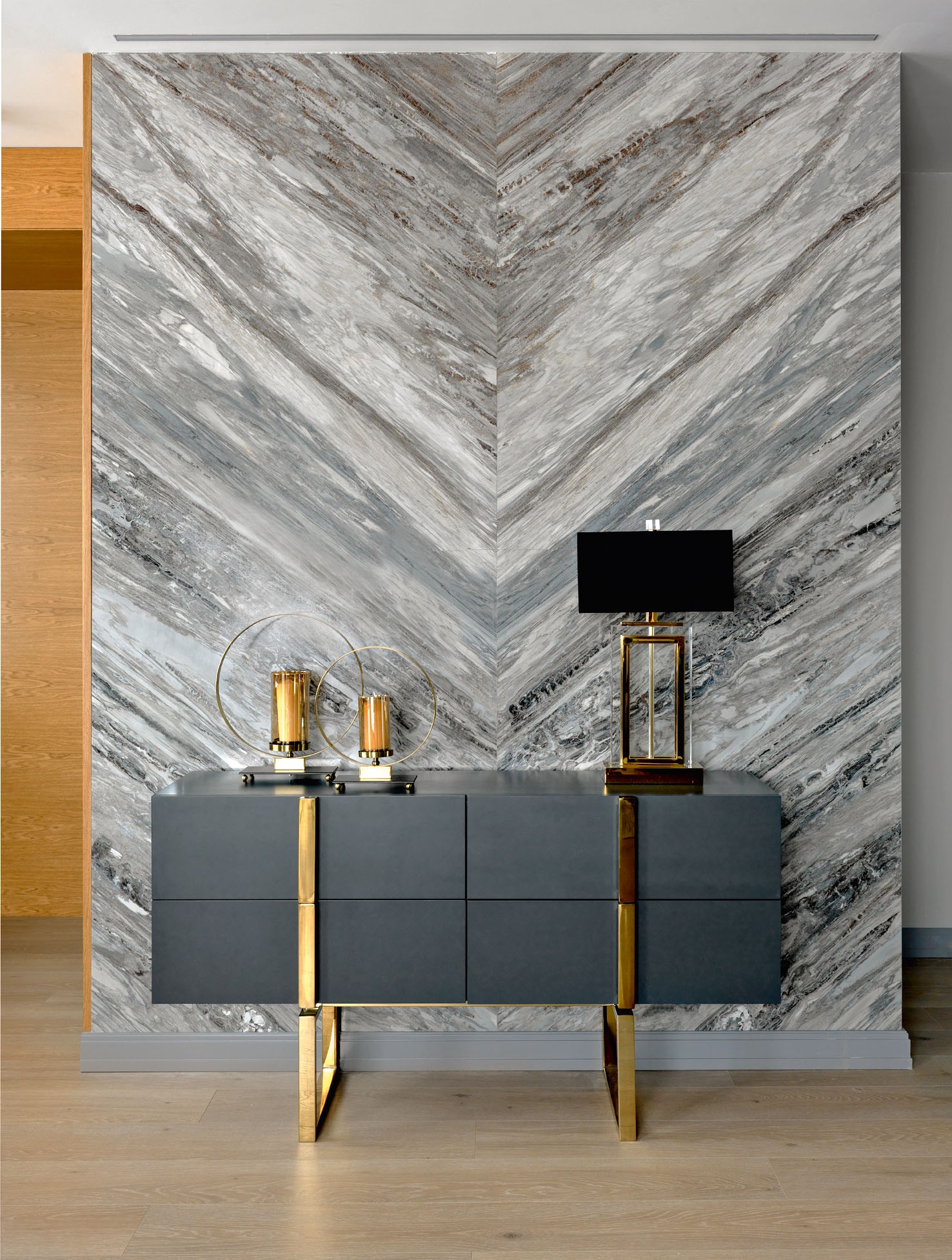 Декоративный акцент в интерьере прихожей — стена, облицованная мрамором Palissandro Nuvolato. «Цветовая гамма камня, состоящая из глубокого серовато– синего цвета и землисто–коричневатого орехового, мерцающая при свете, — редкое и необычное сочетание, — замечает Ольга Чуркина. — Мы объехали все московские склады, прежде чем нашли слэбы нужного размера и рисунка». Настольная лампа, Eichholtz. Подсвечники, Unico