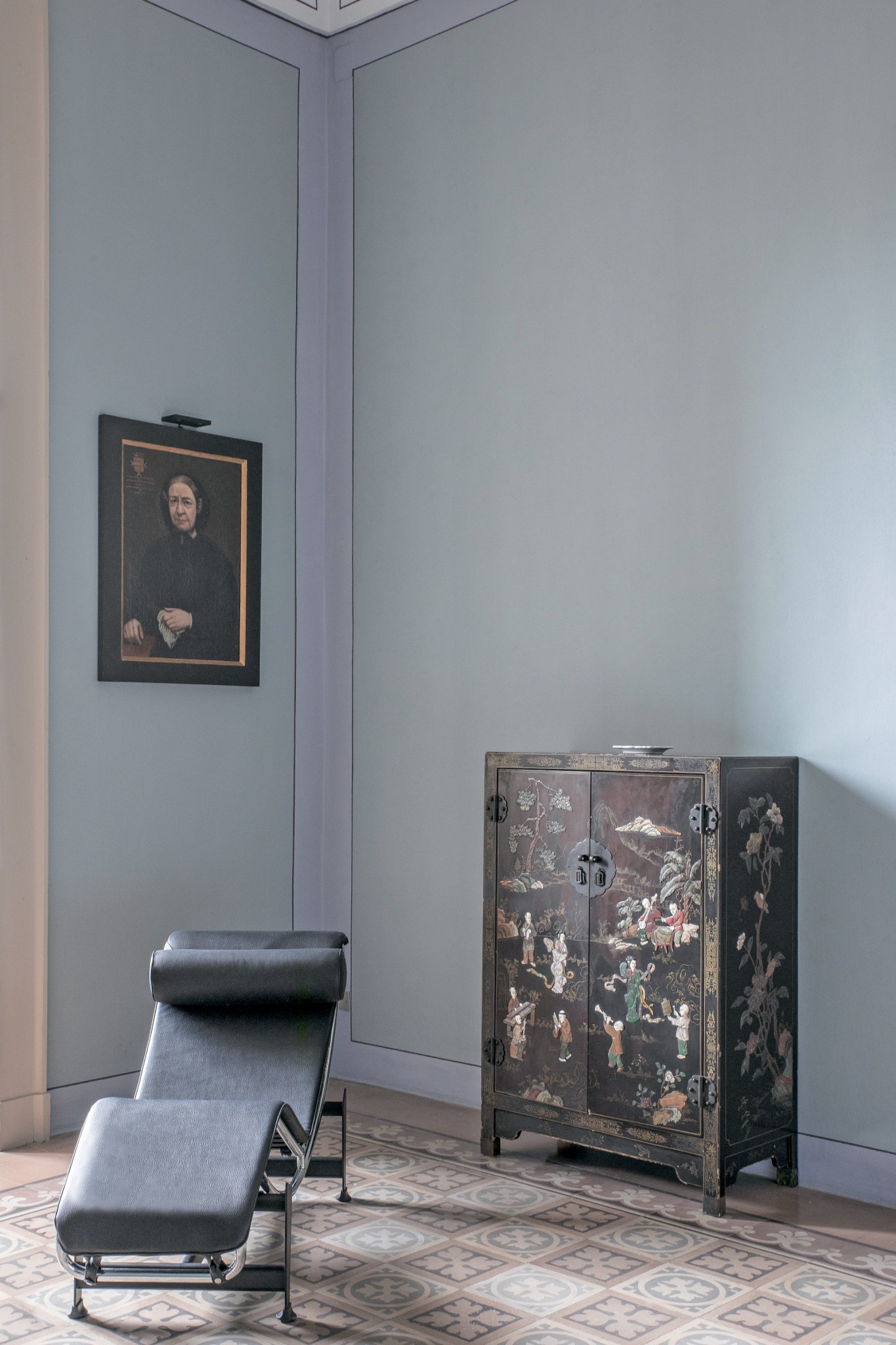 «Мы восстановили историческую отделку: что-то из лепнины и, конечно, великолепные росписи потолков и стен, — рассказывают архитекторы. — А также вернули на своё место часть мебели, которая хранилась в семье. Отчистили плиточные полы. Только подумайте, в каждом помещении они выложены плиткой своего рисунка!» Что касается наполнения, то интерьер выглядит едва ли не аскетичным. Таково было пожелание заказчиков. Они не хотели загромождать величественные залы бесконечными буфетами и этажерками. Паломба подобрали самый минимум, сделав акцент на дизайнерской, но не броской, минималистичной мебели. Часть обстановки происходит из семейного фонда рода, но опять же тут нет ничего вычурного. Даже старинная мебель дышит сдержанным благородством.