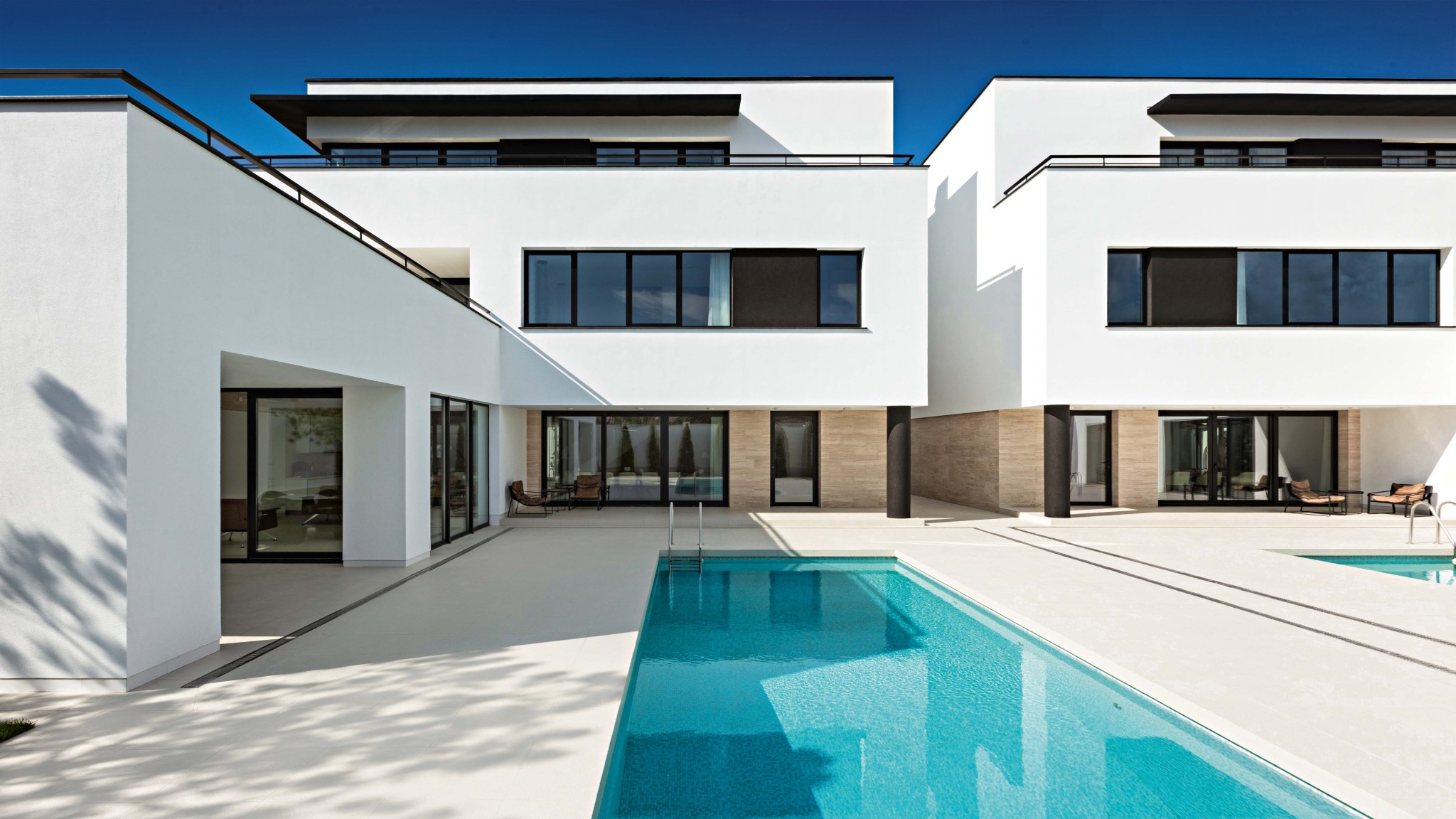 Илья Темнов: «Ключевым фактором для разработки интерьера и экстерьера резиденции было желание хозяев создать максимально открытое, но приватное пространство, состоящее из двух отдельных симметричных объёмов. Чтобы решить эту проблему в черте города, мы поставили корпуса рядом, максимально близко друг к другу, а за счёт Г-образной формы каждого из них появился внутренний двор, закрытый с трёх сторон»
