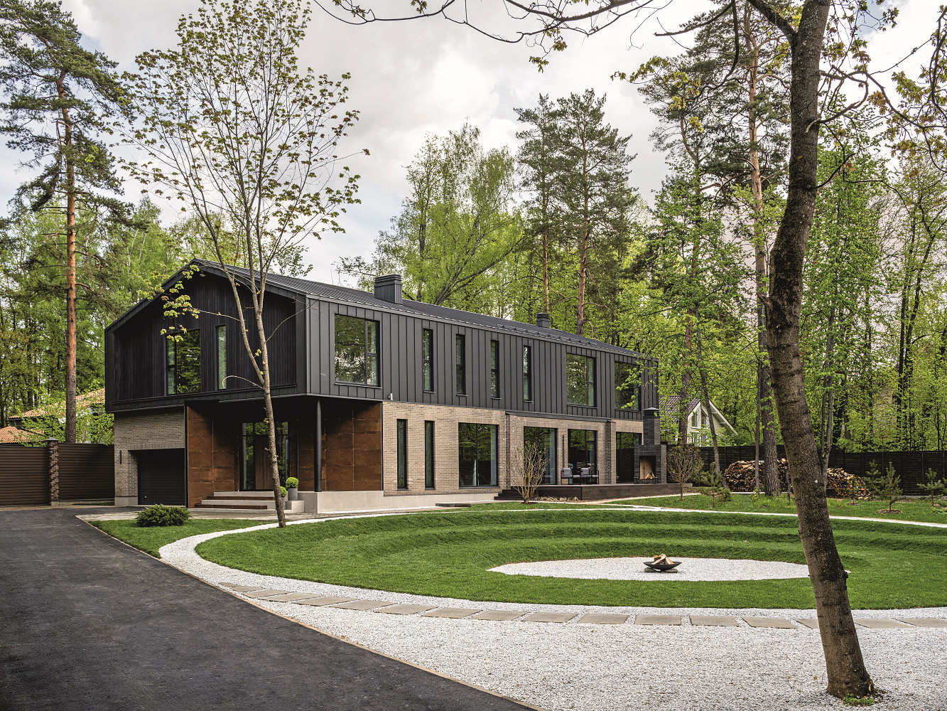 Особое внимание мы обращаем на атмосферу: она должна быть располагающей, душевной. Поэтому мы и выбрали для застройки это тихое место рядом с Москва-рекой, лесом и парком. И название поселка говорящее — Благодать». Недалеко пролегает поселковая дорога, поэтому дом построили в глубине участка. Уже со стороны въезда открывается впечатляющий вид на ландшафт. Продуманы и ракурсы на пейзаж из панорамных окон главного фасада, который обращен строго на юг — в климате Подмосковья такая планировка оправдана. Ландшафтное решение учитывает естественный рельеф местности.