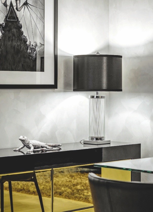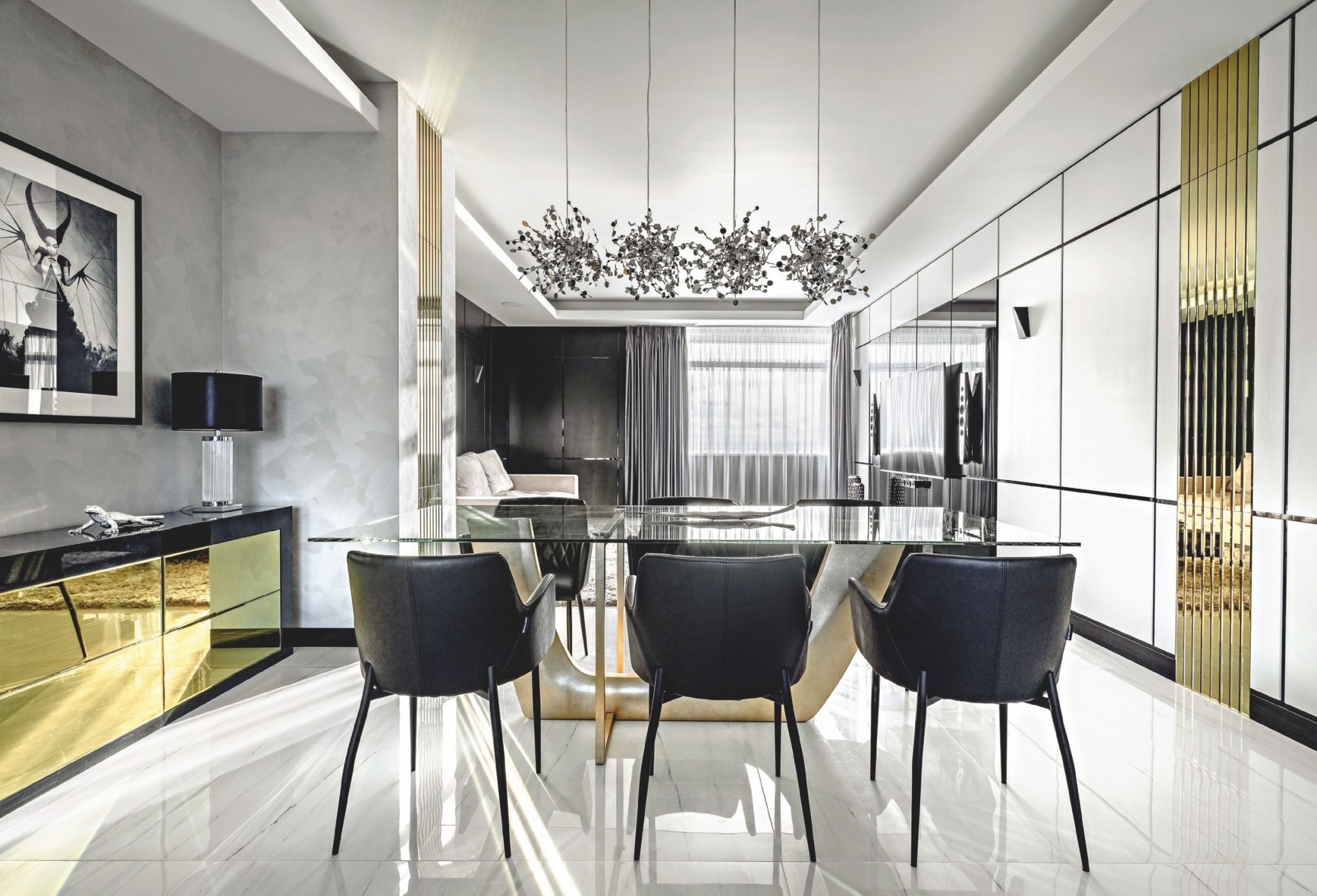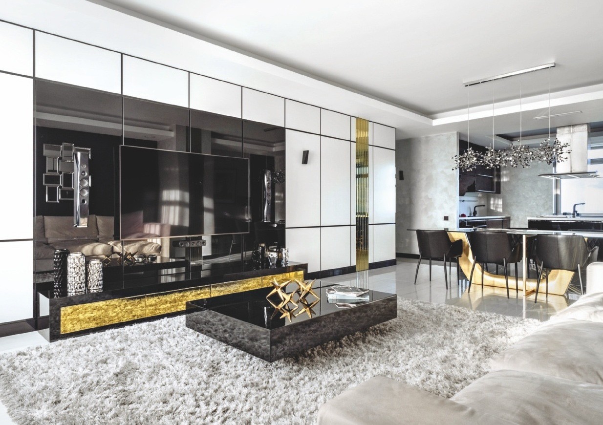 В стилистическом плане предпочтение было отдано современному стилю с большим количеством зеркальных, золотых и серебряных поверхностей. «К оформлению квартиры холостяка мы подошли экспериментально, — замечает Дмитрий. — Тихий семейный уют тут уступает место роскоши и контрасту. В отделке использовано много камня. Вместо деревянных полов появилось напольное покрытие из каменных плит широкого формата. Стены в санузлах — из керамогранита под мрамор. В гостиной штукатурку цвета металлик «под шёлк» скомбинировали с выкрашенными в чёрный и белый цвет панелями из МДФ, а стены спальни декорировали панелями из замши и экокожи. Особо драматично на этом фоне смотрятся золотые зеркальные вставки, перегородки из стекла золотого цвета и чёрная мебель с глянцевыми поверхностями». Большая часть мебели выполнена по эскизам авторов на заказ. Диван, журнальный столик, обеденный стол и другие предметы авторы разработали в соответствии с необычной дизайн–концепцией. К ним идеально подошли отдельные вещи фабрики EICHHOLTZ, а люстры TERZANI отлично дополнили образ блестящего интерьера.