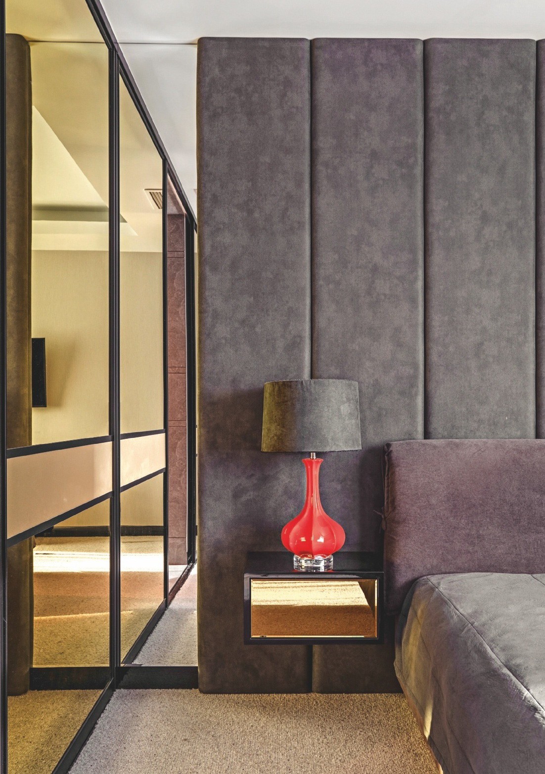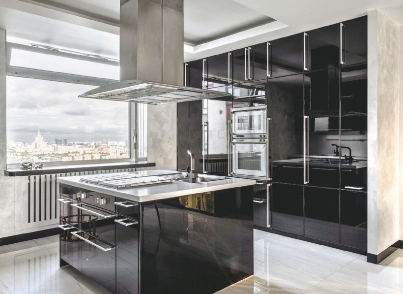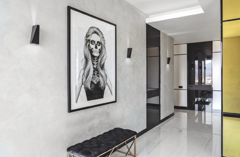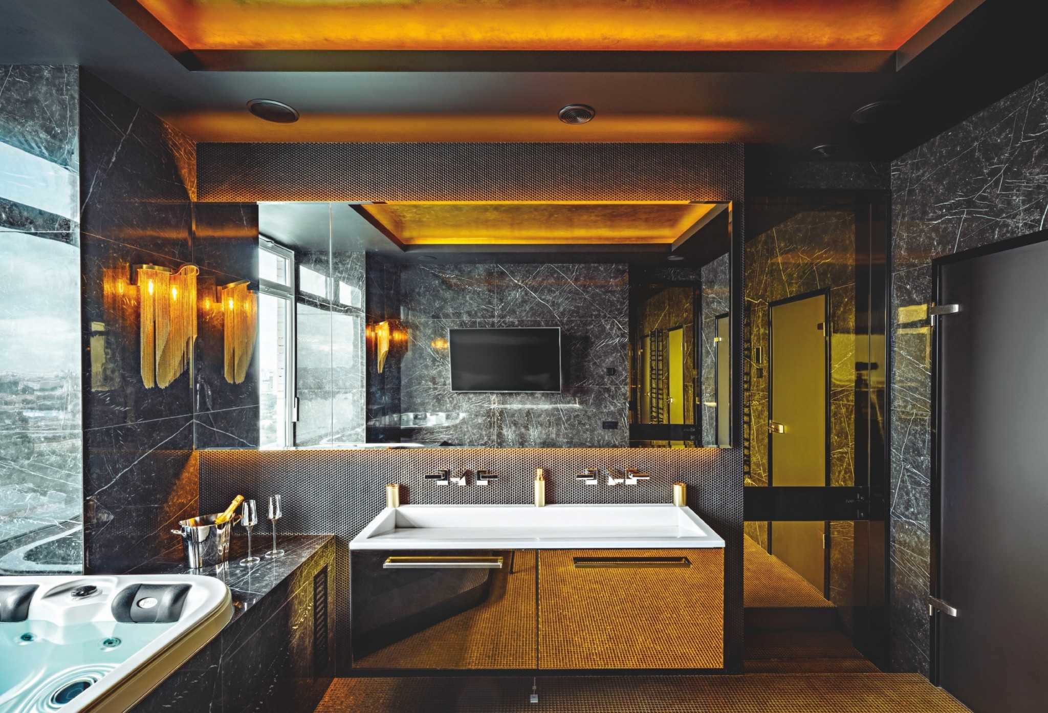 Елена и Дмитрий Коршуновы приступили к проекту, когда ещё не была окончена чистовая отделка стен. Это дало возможность внести коррективы в планировку квартиры. Гостиную объединили с кухней–столовой — получилась просторная общественная зона, удобная как для отдыха хозяина, так и для приёма гостей и устройства вечеринок. В соответствии с концепцией существенно расширили и санузел. «Ванная — это самое эпичное в визуальном плане помещение, — говорит Дмитрий. — Мы с самого начала задумывали сделать её грандиозной. Вместо стандартной гидромассажной ванны установили настоящий уличный бассейн у панорамного окна, предварительно усилив конструкции перекрытия. Лежать в нём и любоваться пейзажем, открывающимся с высоты птичьего полёта, невероятное наслаждение. Также оборудовали полноценную душевую комнату с хаммамом. Стены и пол отделали керамогранитом под чёрный мрамор и золотой мозаикой — получилось драйвово и броско, в духе фэнтези».