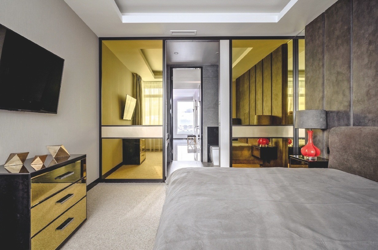Предпочтение отдано современному стилю с множеством зеркальных, золотистых и серебристых поверхностей