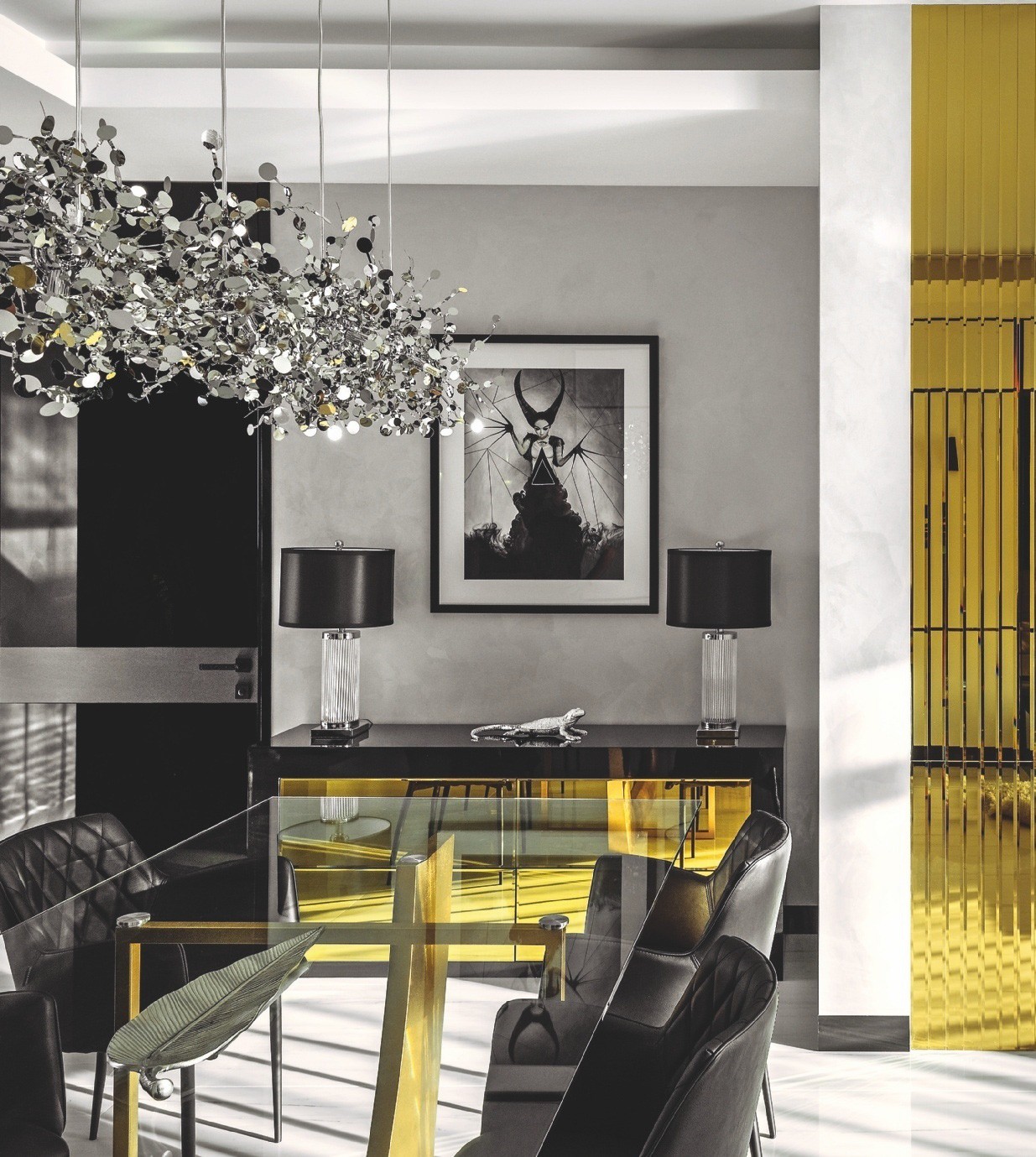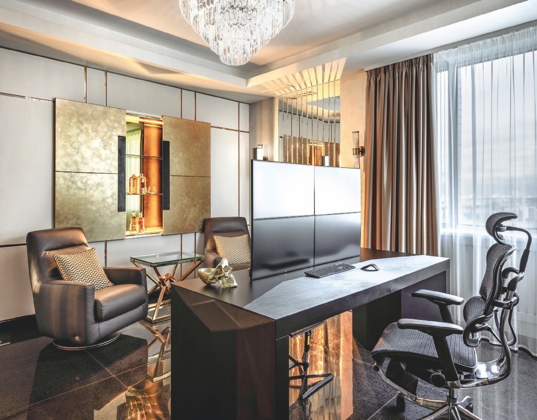 Дмитрий Коршунов: «Главной задачей для нас было создание яркого, запоминающегося пространства, впечатляющего своей смелостью и амбициозностью с первого взгляда. При этом ни о какой классике речи не шло, только современные формы и материалы. Получился роскошный интерьер с мужским характером и нотками мистики, загадочности»