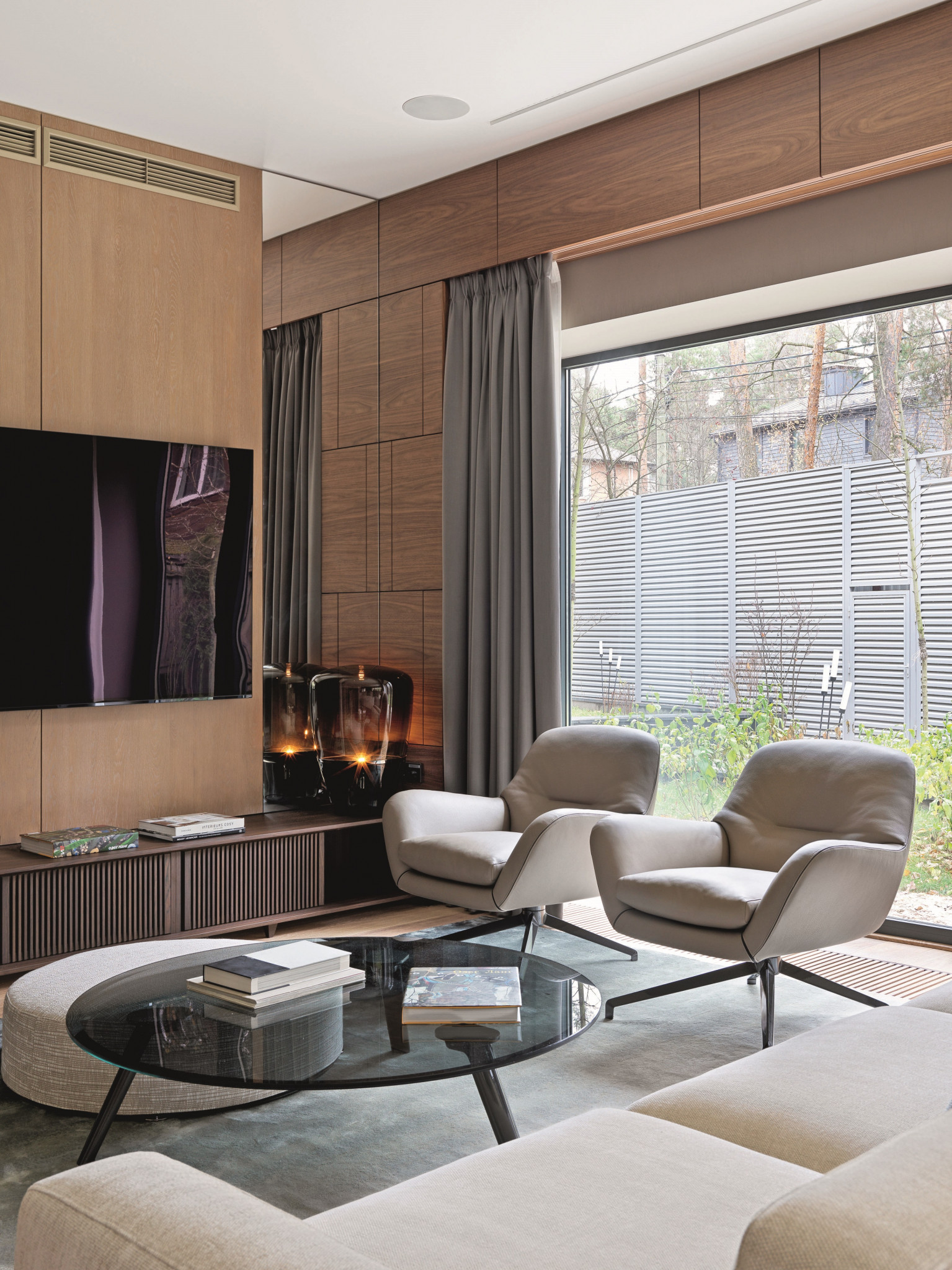 Знакомство с заказчиками — семейной парой с двумя детьми — произошло по воле случая, и, по словам автора проекта Ведрана Бркича, это не помешало им сразу довериться профессионалам в подборе стилистики будущего интерьера и в решении функциональных задач. Мало того, в ходе работы площадь проектирования значительно увеличилась, а в финале результат превзошёл все ожидания. «Изначально клиент купил две квартиры, расположенные друг над другом, общей площадью чуть менее 200 кв. м, — вспоминает архитектор. — Однако уже на первой встрече стало понятно, что желаемое количество помещений и лестницу нельзя поместить в имеющийся объём. К счастью, соседняя квартира на втором этаже продавалась, и после покупки она почти целиком была отведена под приватный блок, включающий в себя, помимо просторной спальни, ещё и большую ванную, гардеробную и террасу. На этом заказчики не остановились и приобрели помещение на минус первом этаже, где помимо постирочной мы расположили фитнес–зал, оружейную комнату и винотеку. Так в гостиной появился прозрачный люк в полу с винтовой лестницей вниз». В итоге на первом этаже авторы проекта разместили кухню, гостиную, столовую, а также кабинет и гостевой санузел. Второй этаж отвели под две детские комнаты с игровой между ними, комнату няни, блок мастер–спальни и несколько ванных комнат. Именно грамотная планировка обеспечила ту степень комфорта, которой ждут от больших загородных домов. Сходства до степени смешения с собственным домом квартире добавило и расположение жилого комплекса за городом, в  окружении соснового леса. Природный пейзаж за панорамными окнами повлиял на стилистику интерьера. «После общения с заказчиком и просмотра подобранных им референсов мы пришли к выводу: нужен современный, уютный интерьер с большим количеством деревянных фактур,—комментирует архитектор Анна Гармаш. — Чтобы подчеркнуть связь внутреннего пространства с природой за окном, мы использовали максимальное количество натуральных материалов». Создать атмосферу загородного дома помогли и предусмотренные застройщиком дымоходы. Так, гостиную украсил настоящий камин с топкой и трёхсторонним стеклом, чтобы горящий огонь был виден и в гостиной, и в холле. Единственным минусом квартиры стали хоть и панорамные, но низкие окна с непропорционально широкой