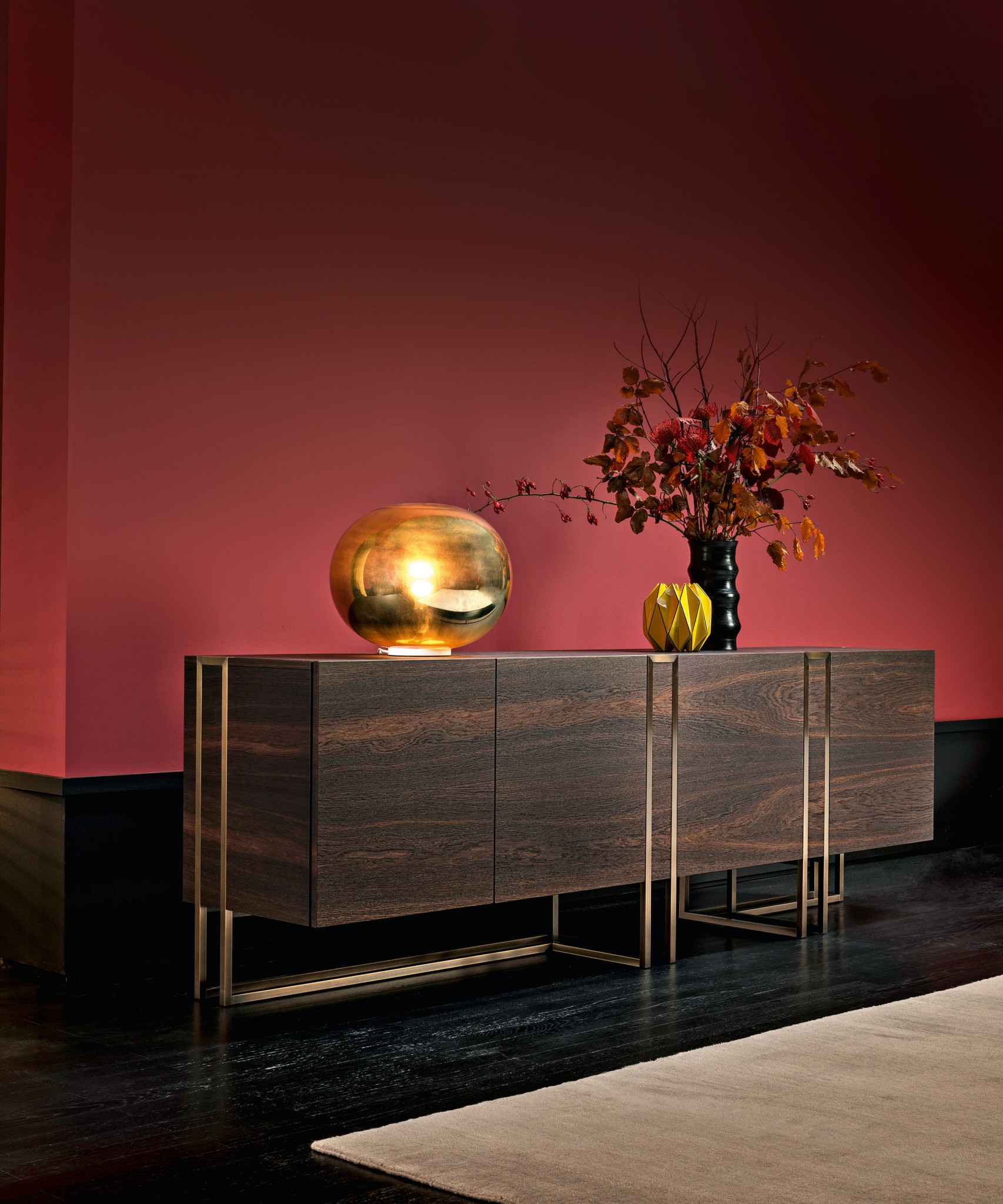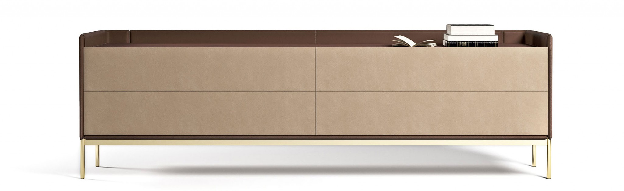 Бренд Aston Martin славится не только роскошными спортивными автомобилями, но и коллекцией мебели под эгидой Formitalia Luxury Group, в разработке которой принимают участие те же дизайнеры. Изящно вытянутая тумба с чуть скруглёнными углами корпуса носит название V246 и отделана натуральной кожей и шпоном ореха. Тонкие и светлые латунные ножки создают ощущение лёгкости, невесомости.