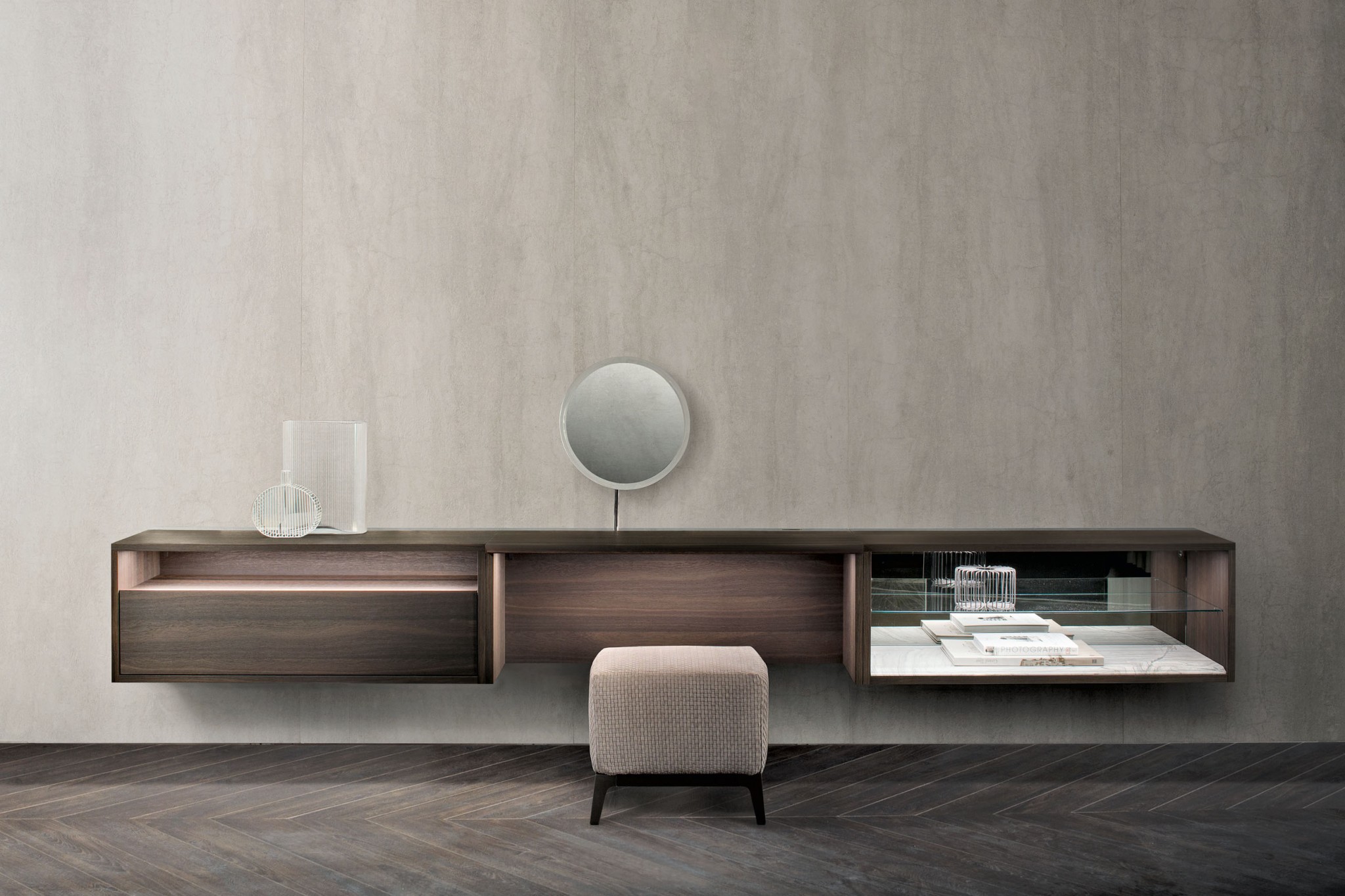 C-System от фабрики Flou состоит из горизонтальных модульных блоков. Компактные размеры и довольно лаконичные формы компенсируются благородной отделкой из шпона древнего окаменелого дерева или тонированного дуба, внутри используется натуральный мрамор. Модули дополнены стеклянными полочками и светодиодной подсветкой.