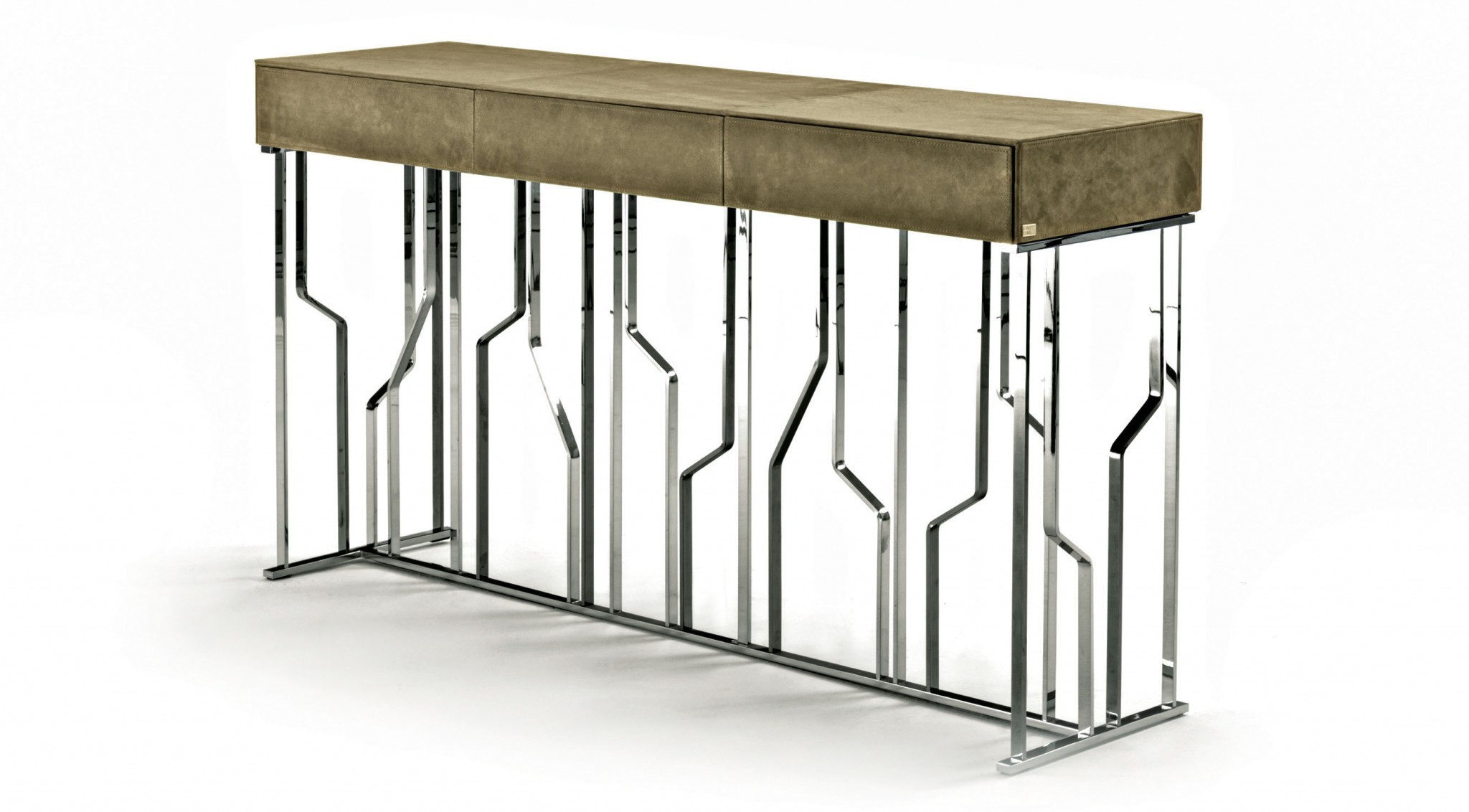 Консоль Ginza evo для фабрики Longhi создал итальянский дизайнер Алессандро Ла Спада, чей провокационный и эффектный стиль в дизайне уже стал узнаваемым. Для данной консоли он использовал натуральную замшу и хромированное основание.