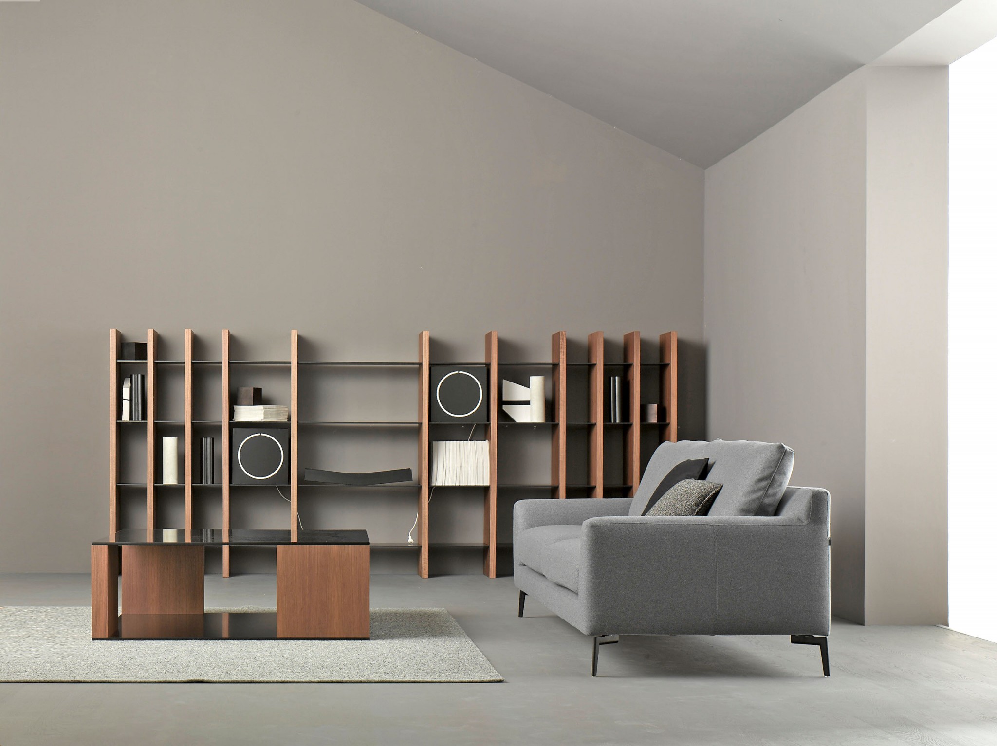 Библиотека Parere от фабрики Amura предоставляет большую свободу для творчества. С её помощью можно выстраивать пространственные композиции из различных модулей, создавать бесконечное количество конфигураций. Дизайн построен на контрасте вертикальных стоек определённой толщины в отделке из ореха каналетто (дуба, клёна) и тонких горизонтальных полок из лакированного металла.