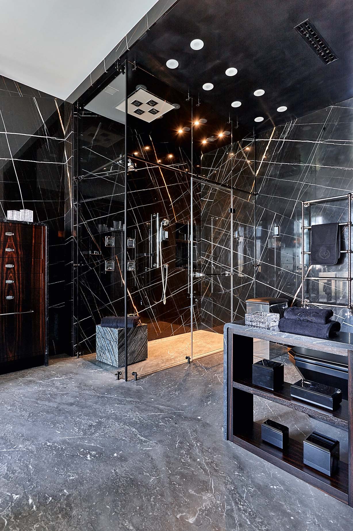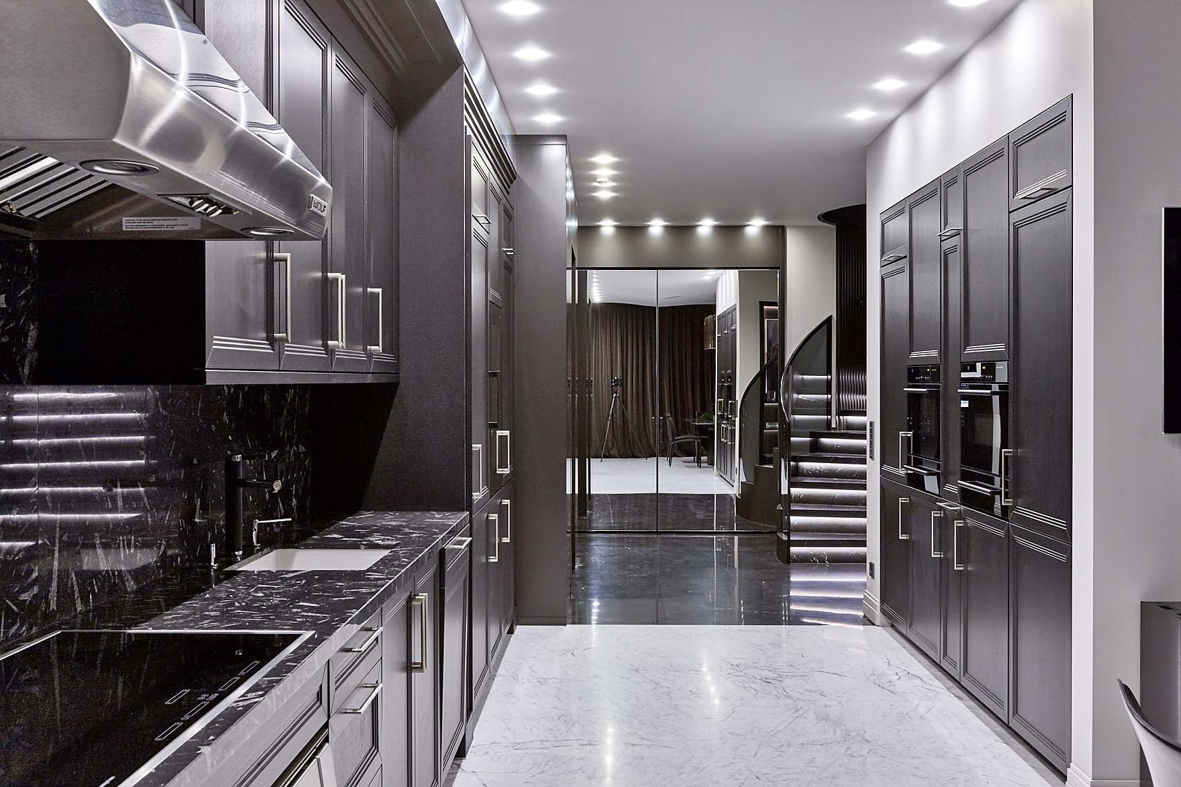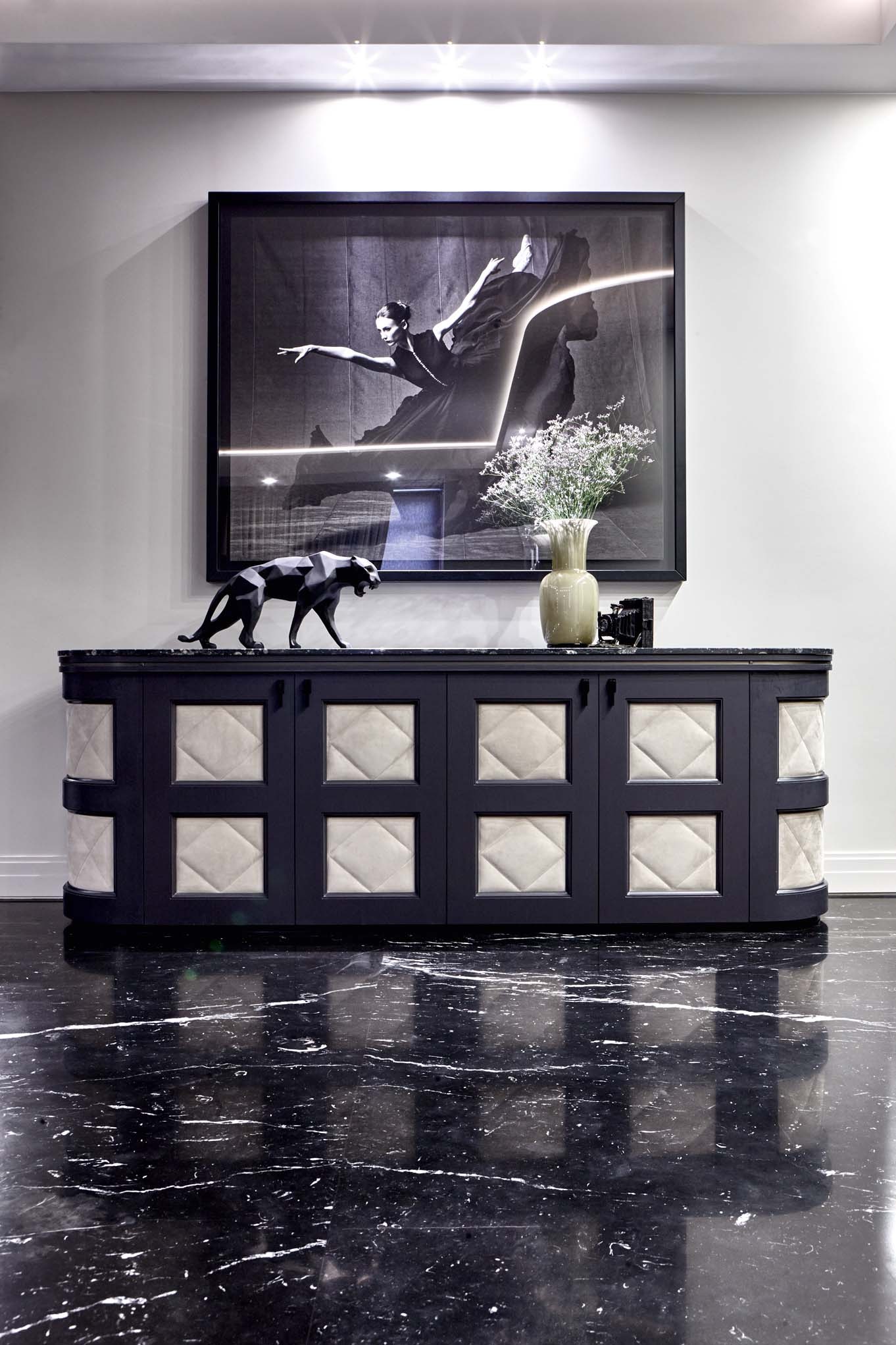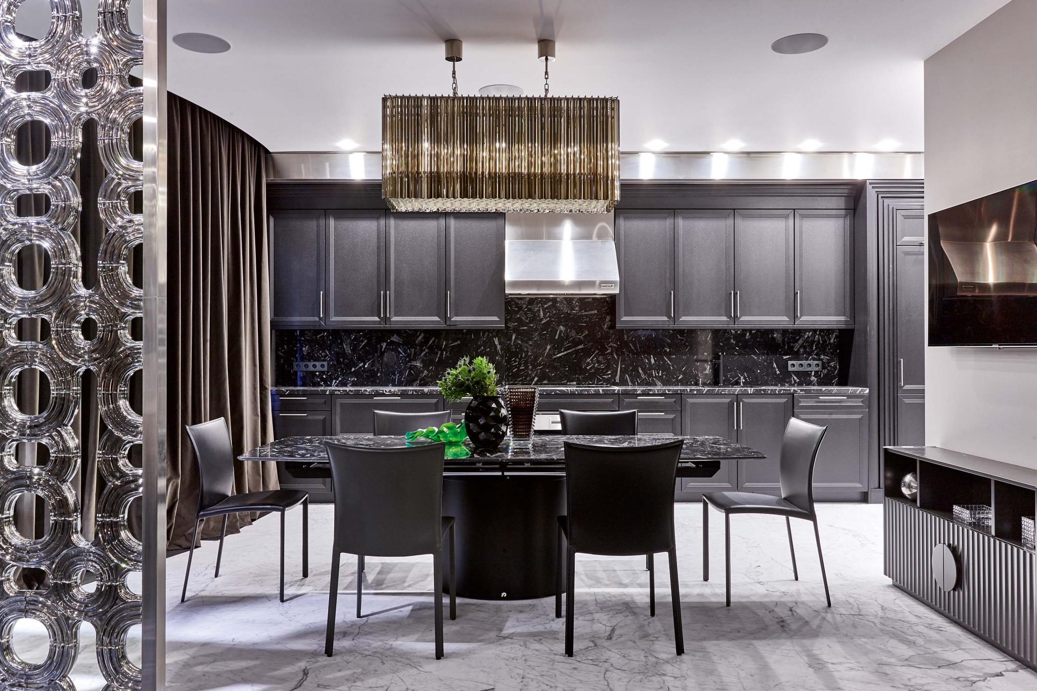 «Хозяин квартиры — эстет и неординарная личность, человек с богатым воображением и жизненным опытом, — говорит Анна. — Он генерировал идею за идеей, а мы придавали им форму и наполняли содержанием. Оттенки серого, чёрного, серебристого, стекло, хрусталь, блеск металла и зеркал, любовь к большим открытым пространствам послужили основой для воплощения этого шикарного проекта в жизнь». Акцент в отделке сделан на эксклюзивные, роскошные материалы (редкие сорта мрамора, дерева, хрусталь) и элементы декора. Так, например, столешница кухни и топ обеденного стола изготовлены из редчайшего камня с окаменелостями возрастом более 150 миллионов лет. Индивидуальный характер пространству придают и арт–объекты, которые заказчик отбирал лично. Среди них — авторская фотография Владимира Фридекса, на которой изображена балерина Светлана Захарова в проекте «Стоп–кадр», скульптуры из чёрного матового стекла, предметы и миниатюры, привезённые из разных стран.