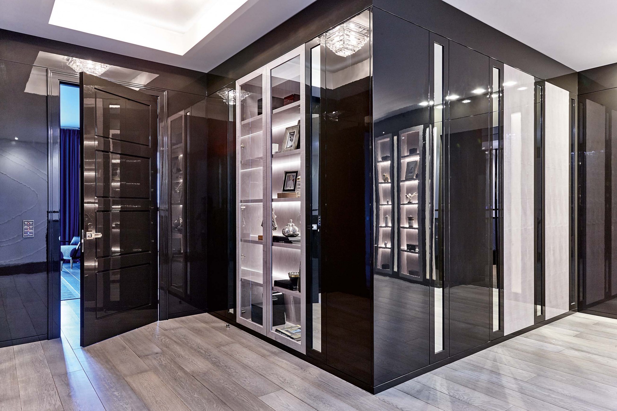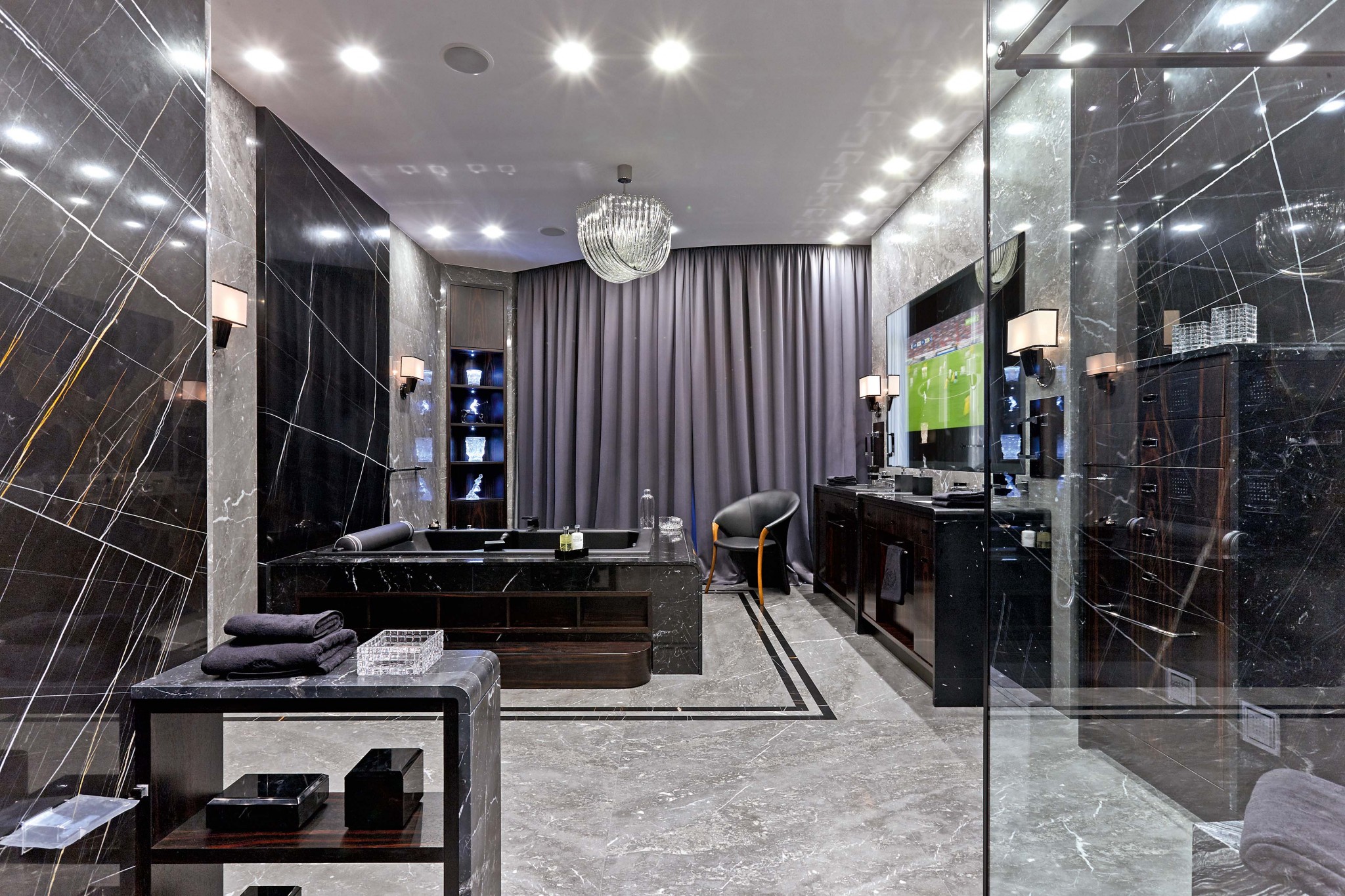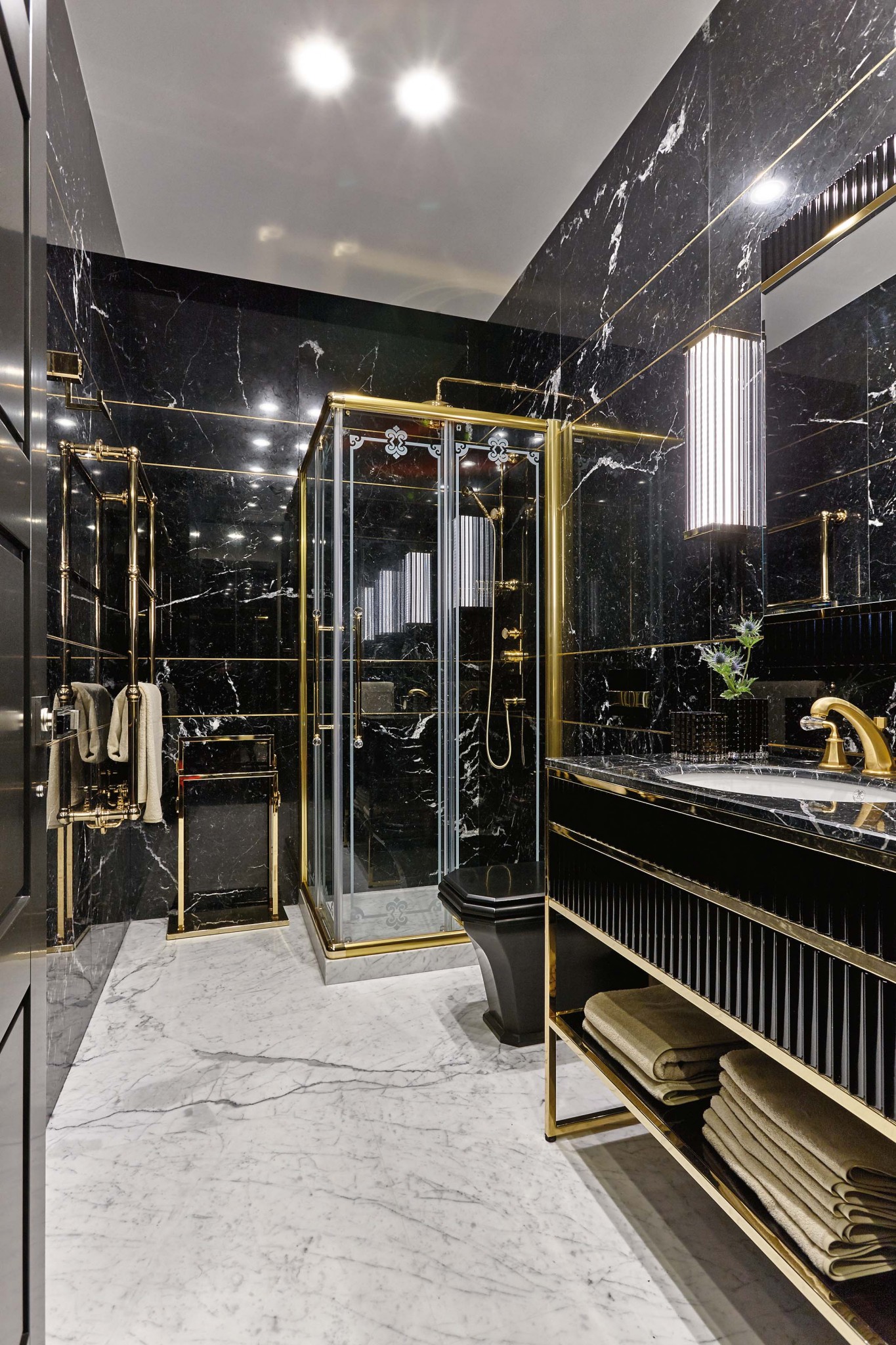 «Хозяин квартиры — эстет и неординарная личность, человек с богатым воображением и жизненным опытом, — говорит Анна. — Он генерировал идею за идеей, а мы придавали им форму и наполняли содержанием. Оттенки серого, чёрного, серебристого, стекло, хрусталь, блеск металла и зеркал, любовь к большим открытым пространствам послужили основой для воплощения этого шикарного проекта в жизнь». Акцент в отделке сделан на эксклюзивные, роскошные материалы (редкие сорта мрамора, дерева, хрусталь) и элементы декора. Так, например, столешница кухни и топ обеденного стола изготовлены из редчайшего камня с окаменелостями возрастом более 150 миллионов лет. Индивидуальный характер пространству придают и арт–объекты, которые заказчик отбирал лично. Среди них — авторская фотография Владимира Фридекса, на которой изображена балерина Светлана Захарова в проекте «Стоп–кадр», скульптуры из чёрного матового стекла, предметы и миниатюры, привезённые из разных стран.