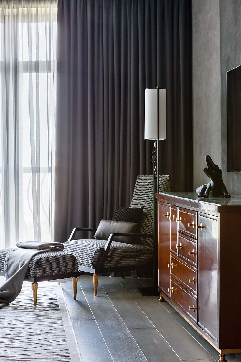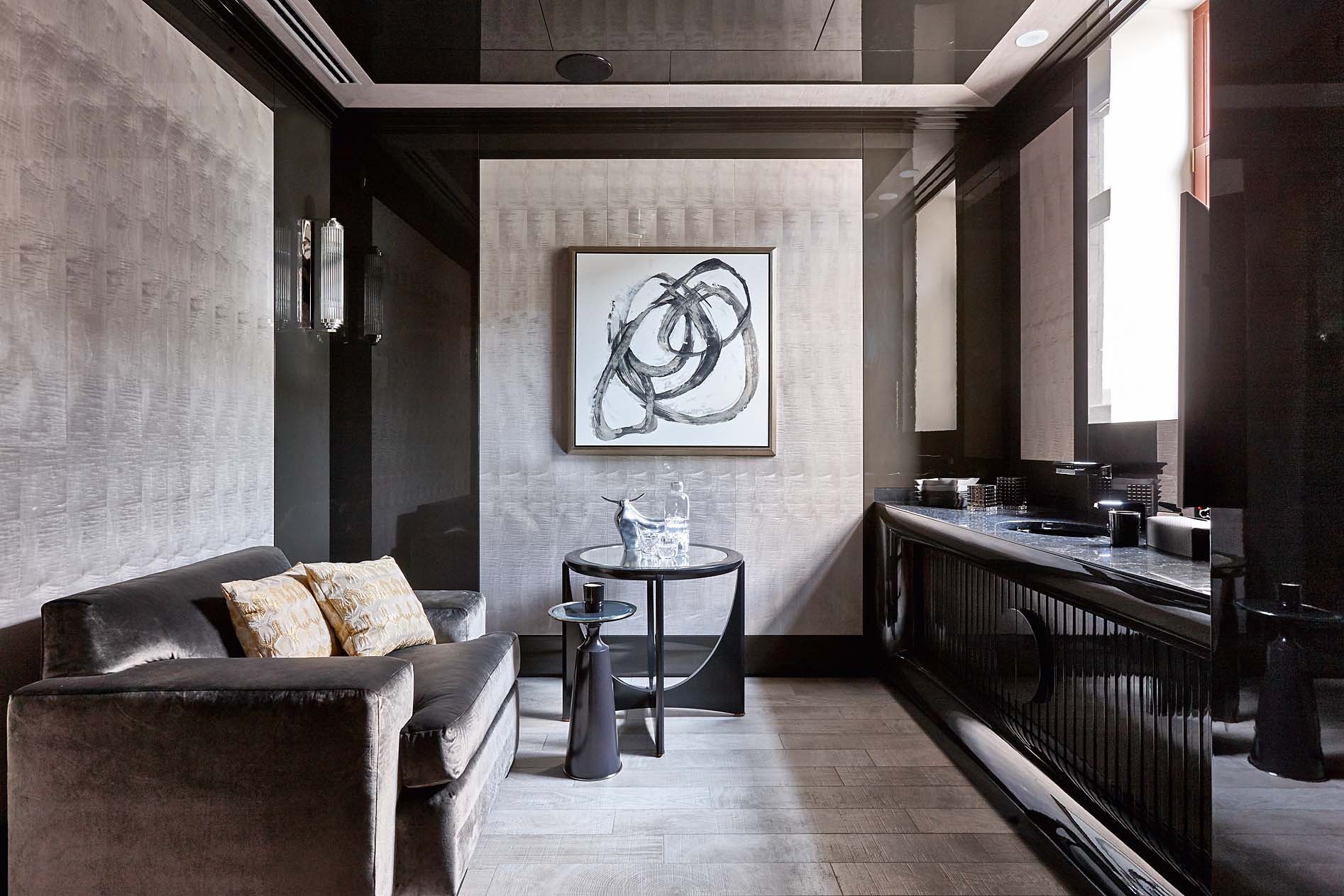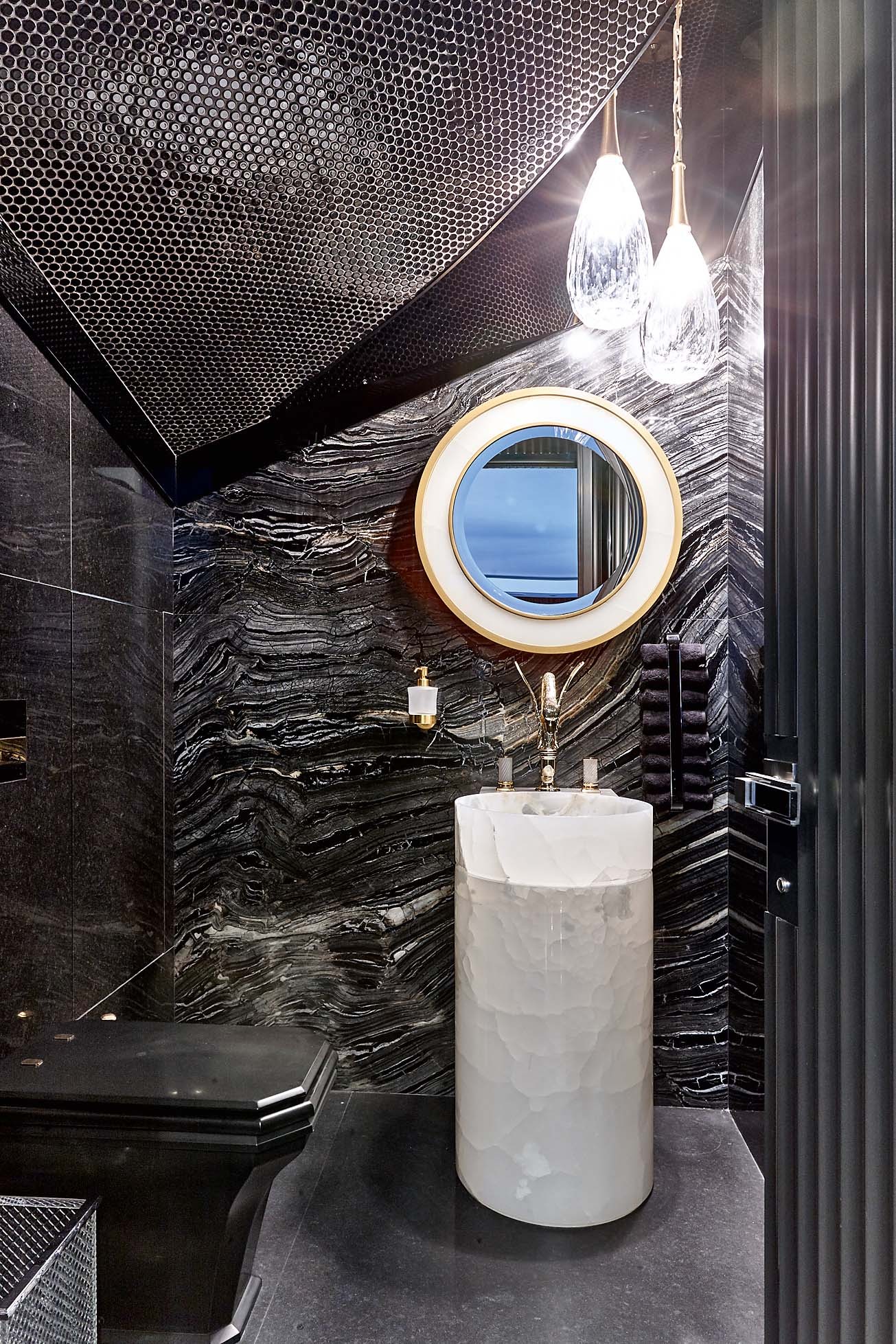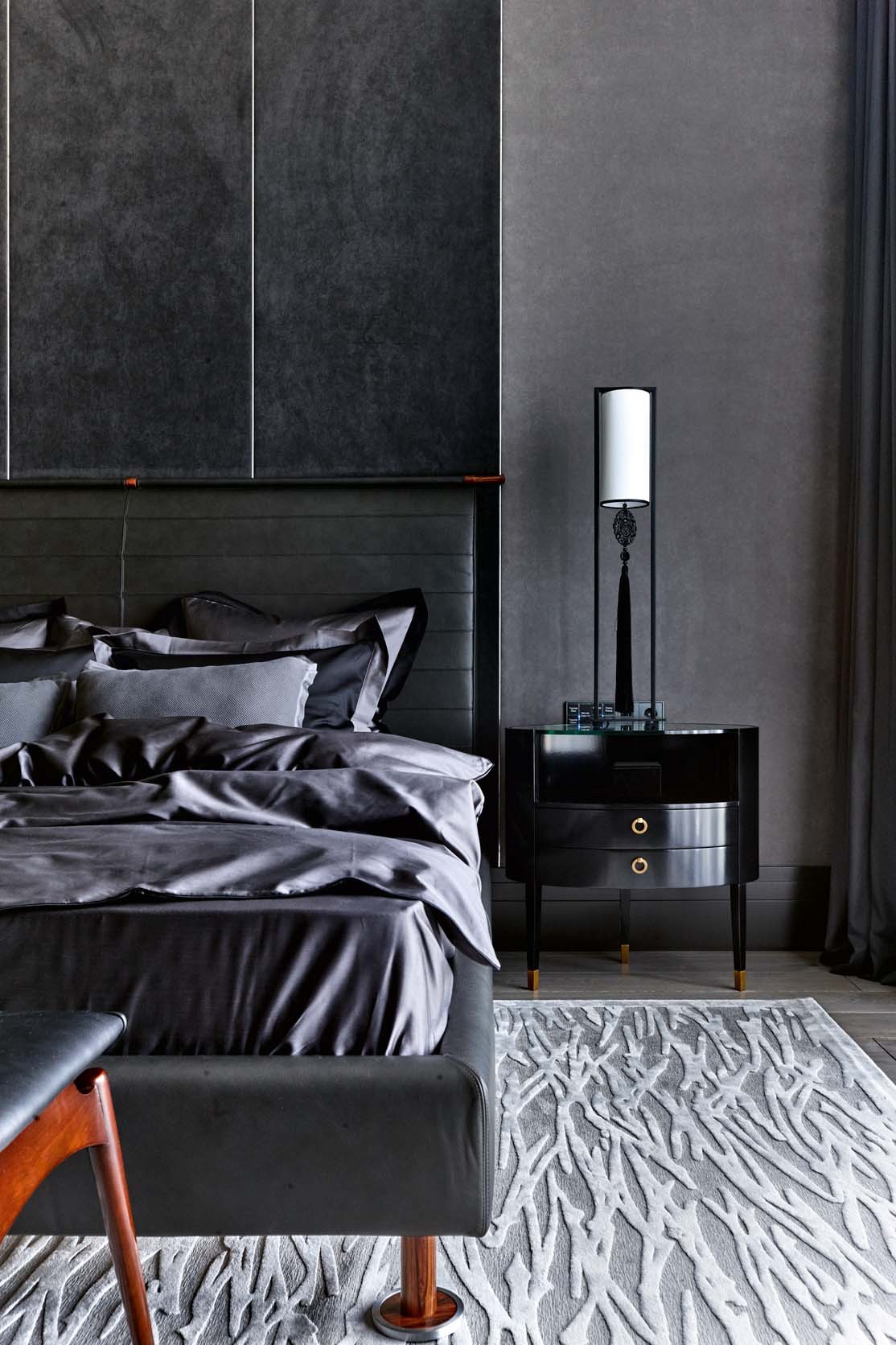 «Хозяин квартиры — эстет и неординарная личность, человек с богатым воображением и жизненным опытом, — говорит Анна. — Он генерировал идею за идеей, а мы придавали им форму и наполняли содержанием. Оттенки серого, чёрного, серебристого, стекло, хрусталь, блеск металла и зеркал, любовь к большим открытым пространствам послужили основой для воплощения этого шикарного проекта в жизнь». Акцент в отделке сделан на эксклюзивные, роскошные материалы (редкие сорта мрамора, дерева, хрусталь) и элементы декора. Так, например, столешница кухни и топ обеденного стола изготовлены из редчайшего камня с окаменелостями возрастом более 150 миллионов лет. Индивидуальный характер пространству придают и арт–объекты, которые заказчик отбирал лично. Среди них — авторская фотография Владимира Фридекса, на которой изображена балерина Светлана Захарова в проекте «Стоп–кадр», скульптуры из чёрного матового стекла, предметы и миниатюры, привезённые из разных стран.