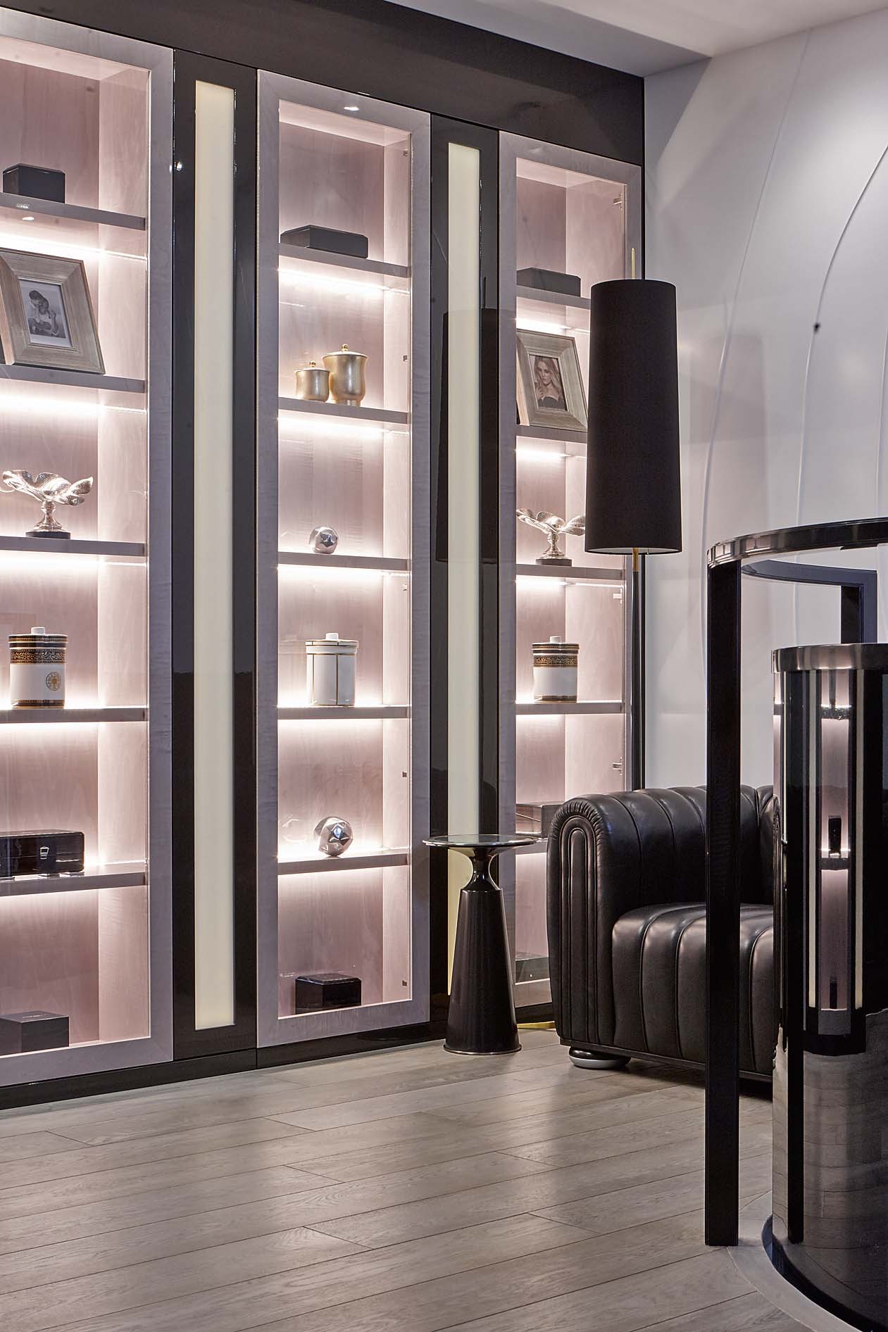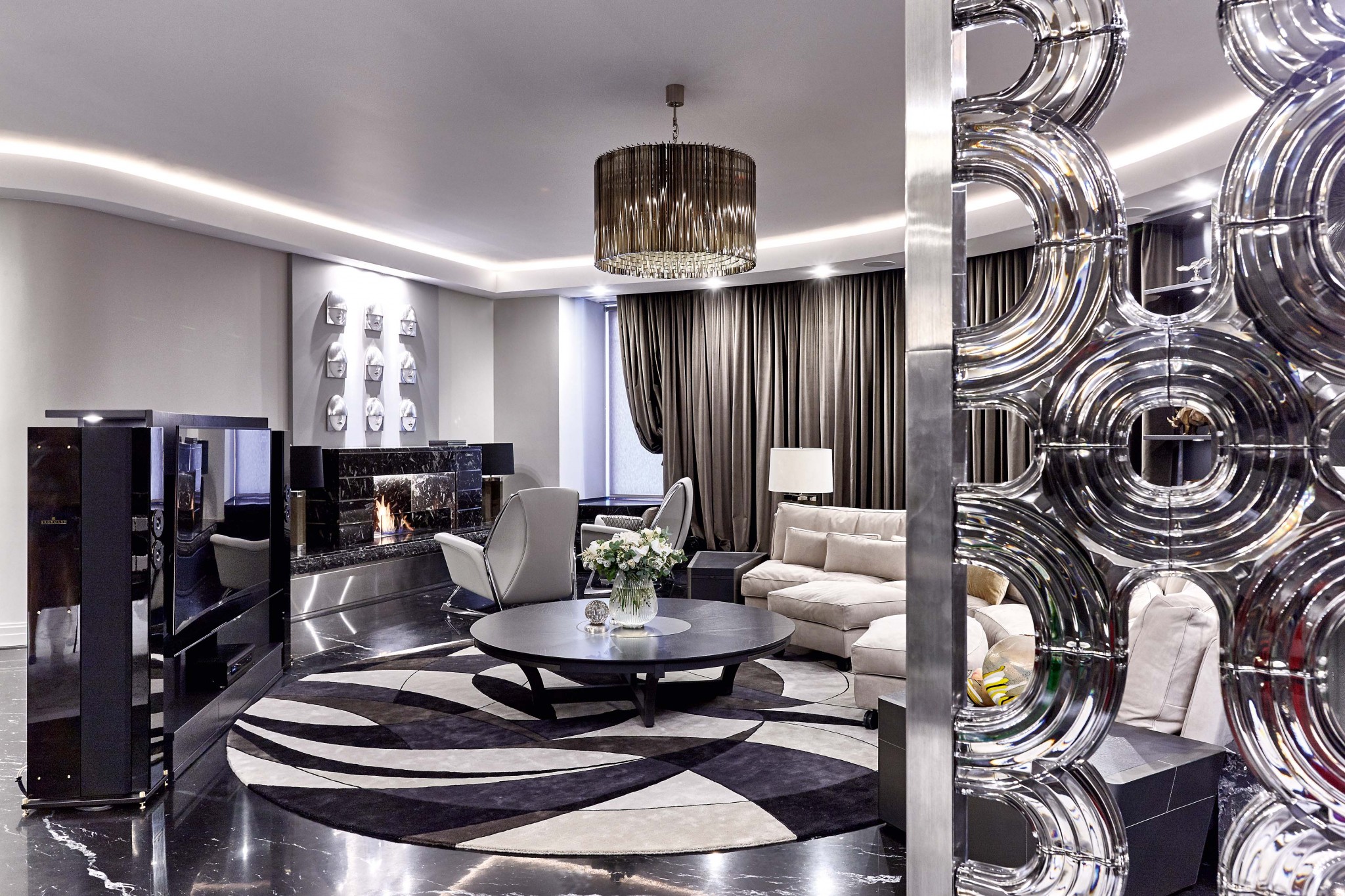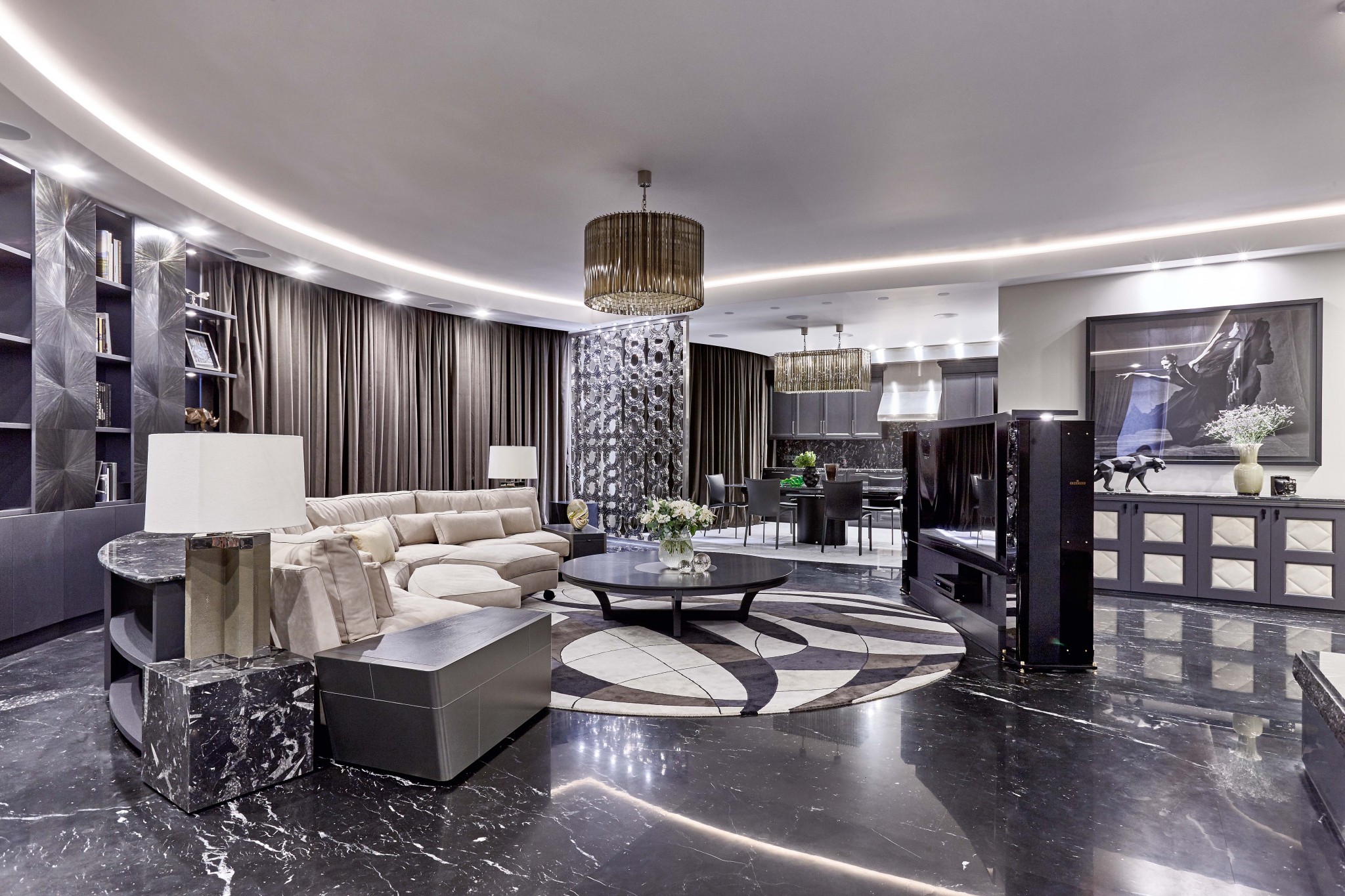 В архитектурное бюро Aaarchitect обратилась семейная пара с пожеланием создать особенный, уникальный интерьер. Двухуровневая квартира находится в центре Москвы, в новом жилом комплексе. Масштабная площадь квартиры — 550 квадратных метров — позволила разместить не только все необходимые помещения, но и спортзал, а также спа–зону. Сердцем пространства стала просторная, роскошно оформленная гостиная, объединённая со столовой и кухней. Архитектура здания продиктовала планировочное решение и общий дизайн: округлые стены фасада задали форму и стиль мебели, а также повлияли на организацию пространства. В центре композиции гостиной — полукруглый диван, за спинкой которого находится бар для виски из коллекции владельца. Радиусную форму фасадов повторяют и другие мебельные элементы: стойка для мультимедиа, библиотека, выполненные на заказ.