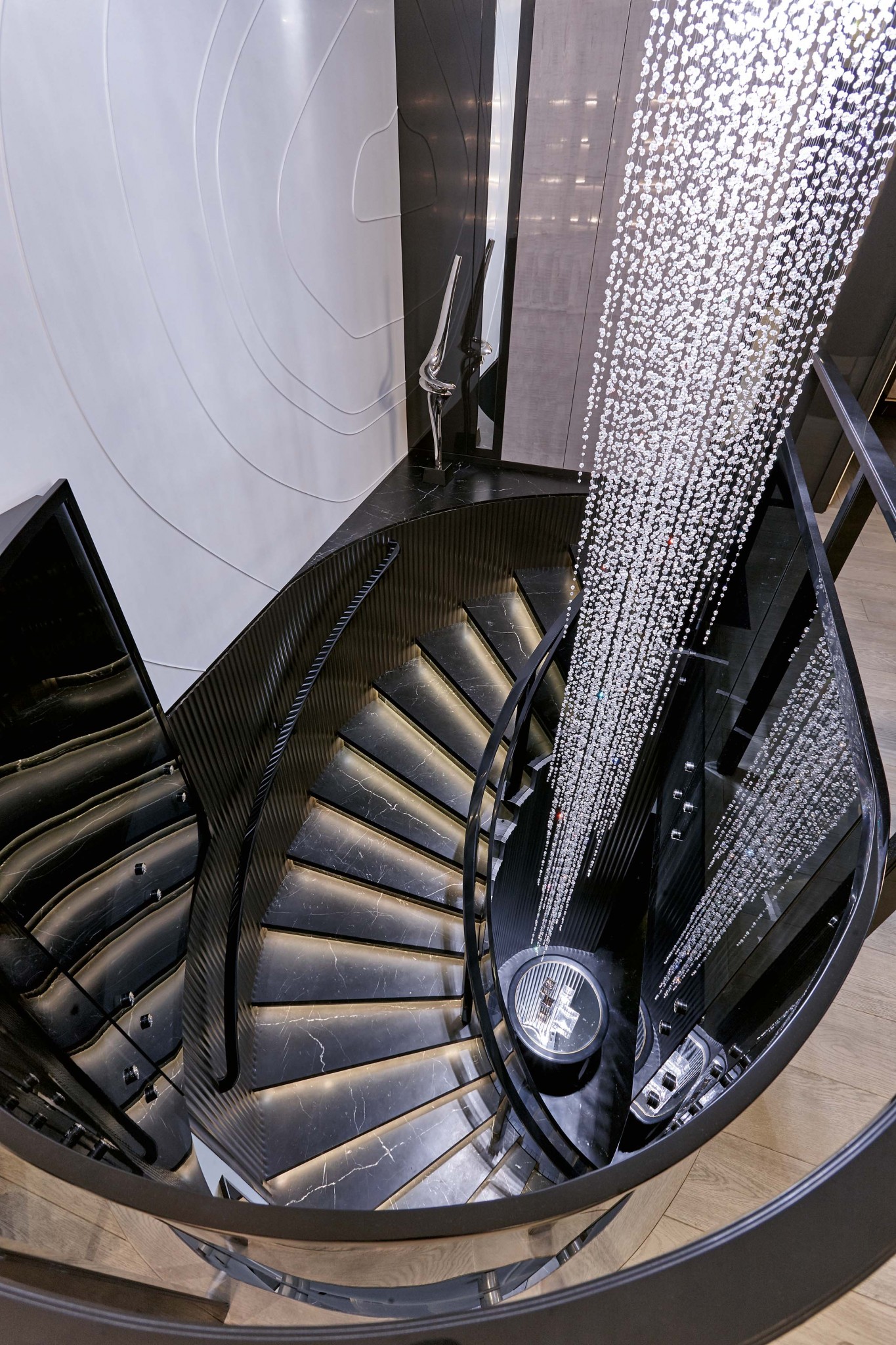 Ещё два уникальных элемента — хрустальная стена, отделяющая столовую от гостиной (изготовлена по эскизам архитекторов фабрикой LASVIT), и лестница сложной конструкции, отделанная мрамором Nero Marquina, с перилами и ограждением из кориана и гнутого стекла. В интерьере вообще много авторских вещей, разработанных Анной Сахаровой и Алисой Лобановой специально для проекта: камин из мрамора и нержавеющей стали, стеновые панели и шкафы, хрустальные люстры и мебель для ванной. Такие вещи делают пространство неповторимым, эксклюзивным, персонифицированным.