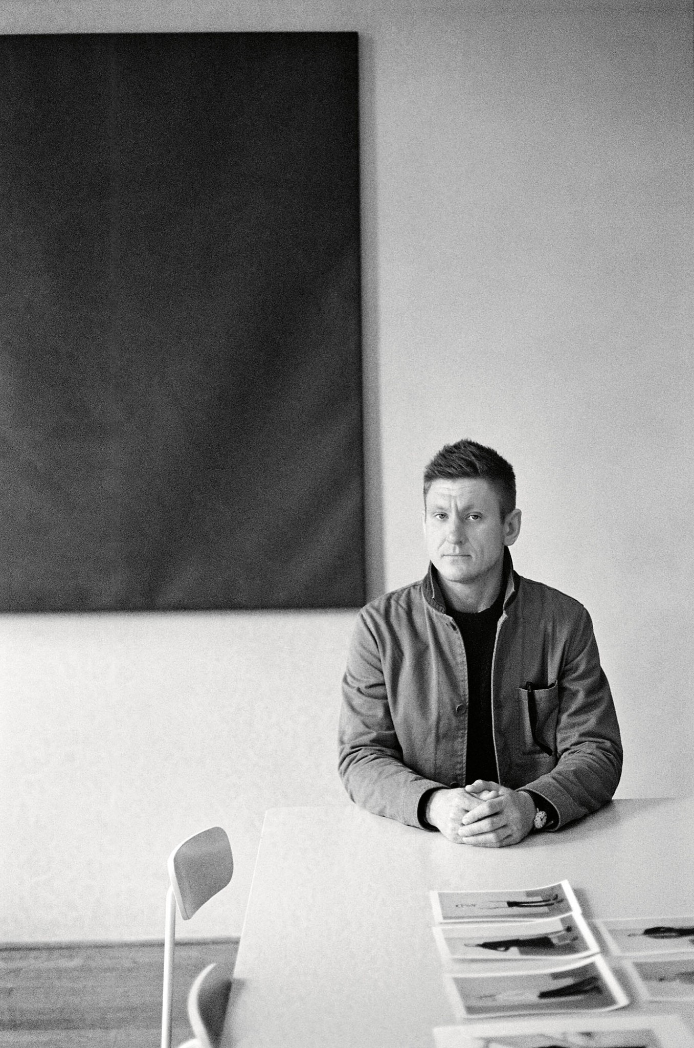 Архитектор Татьяна Хорошева: Это интерьер мужской ванной комнаты при тренажёрном зале. Нам хотелось чуть снизить брутальность помещения и показать, что не нужно относиться слишком серьёзно ко всему, что вас окружает. Поэтому стены из чёрного мрамора украсили ироничные картины голландца Саши Гольдбергера с героями комиксов, выполненных в духе фламандской живописи XVI века. Пол выложен мраморной мозаикой с 3D–эффектом».