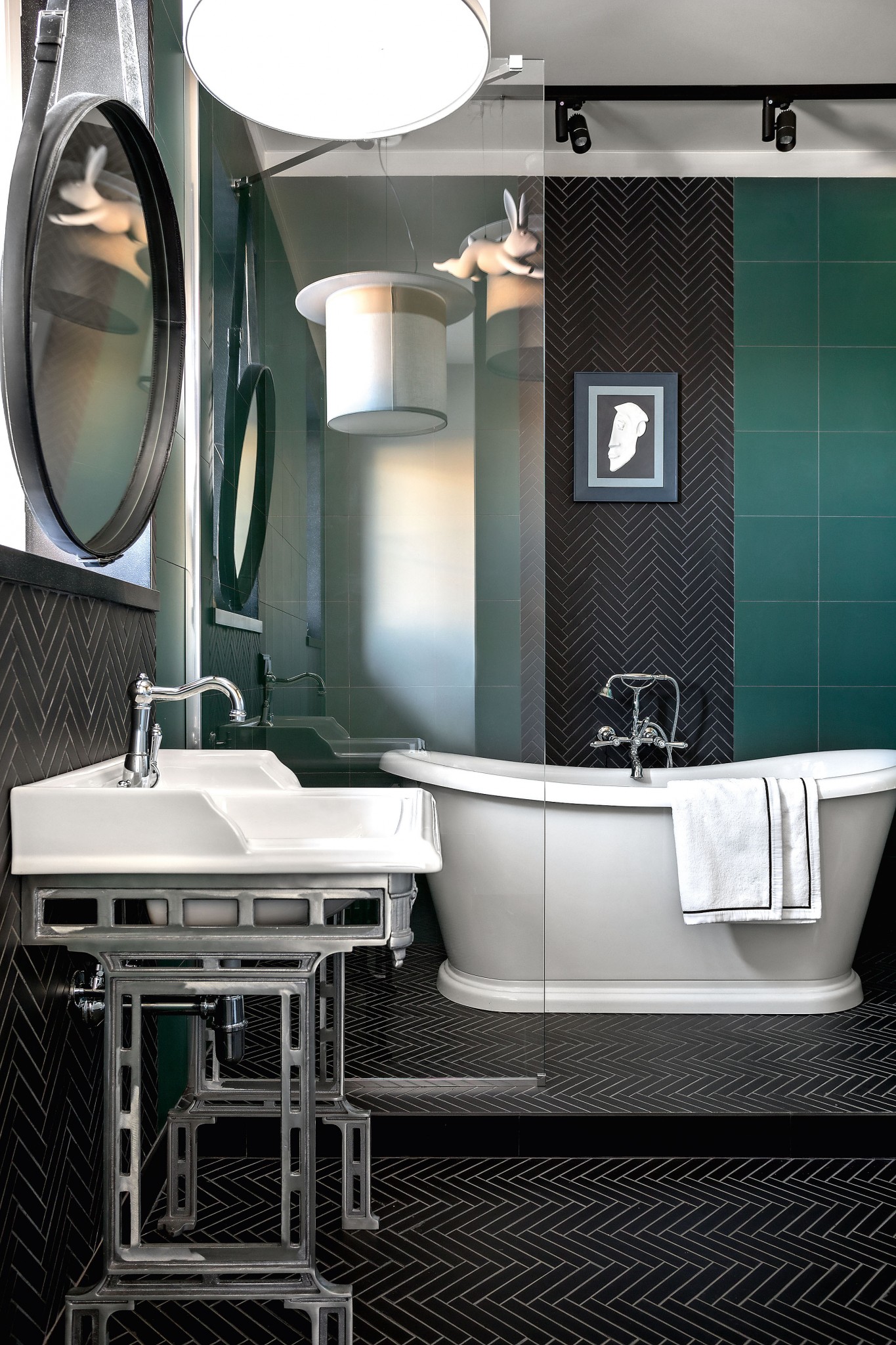 Эта отдельно стоящая ванна и пара умывальников расположены непосредственно в спальне и соседствуют с камином. Такова была идея заказчицы, которую удалось реализовать. Таким образом помимо кровати в интерьере появился ещё один смысловой центр. Стены комнаты окрашены в сложный серый оттенок, бетонные раковины и тумба под ними изготовлены по авторским эскизам. А санузел с душевой кабиной выполнен в чёрном цвете, но в той же стилистике».