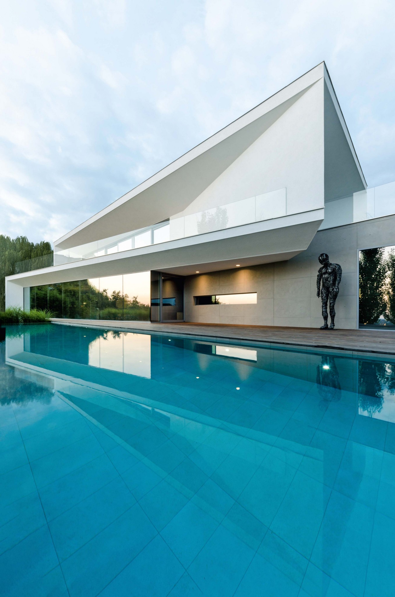 Архитекторы любят давать своим объектам названия, и порой одного–двух слов достаточно, чтобы точно и ёмко охарактеризовать суть концепции, художественный образ и настроение. Именно о таком проекте пойдёт речь. Art Gallery House — одна из наиболее ярких работ кишинёвской студии l i n e a r c h i t e c t s. Частный жилой дом создавался как музей, арт– галерея с предметами современного искусства. Нечто абстрактное, созерцательное, медитативное — такие ассоциации вызывает скульптурная форма белоснежной постройки из бетона, стекла и металла, непонятно каким образом очутившаяся посреди частной малоэтажной застройки под Кишинёвом. Интерьер под стать архитектурному образу. Внутреннее пространство организовано по принципу открытого, перетекающего — такое повсеместно можно встретить в современных интерьерах. Однако планировка приобретает иной смысл и интерпретацию, если посмотреть на неё под другим углом. В ключевых точках пространства архитекторы поместили арт–объекты, которые меняют суть происходящего, наполняют его эмоциями и впечатлениями. «Пространство с самого начала мы задумывали галерейным, чтобы по дому можно было блуждать, открывать разные виды, — поясняет Дмитрий Петров. — А в галерее всегда есть на что посмотреть, и когда хозяева или гости ходят по дому, они видят интригующие арт–объекты. Например, проходя из прихожей в гостиную, если посмотреть ненароком вверх, то можно увидеть скульптуру сидящего человека на балке второго света. Это особенно впечатляет. У главного входа стоит ещё одна скульптура «железного человека». Очень неожиданно, и производит сильный эффект. На подобных ощущениях и построено пространство. Надо заметить, все скульптуры