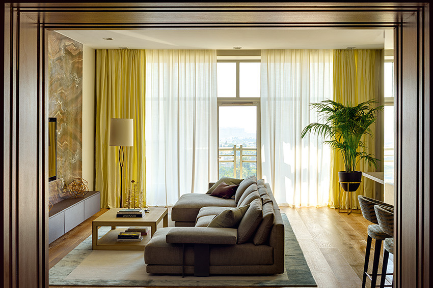 Вера Лемешко вспоминает о проекте с большим трепетом и любовью. Не всякий раз в руки дизайнера попадает объект с такими параметрами: отличным месторасположением, большим метражом, высокими потолками и, самое главное, великолепными видами из окон. Единственное, что огорчало, — многочисленные ограничения, строгий регламент и постоянные согласования на каждом шагу — в Соединённых Штатах это обычная практика, для отечественного профессионала многие вещи были попросту в новинку. «В Америке есть чёткое разделение по всем видам работ, —комментирует Вера, — на каждый этап нужно получить согласование и приобрести страховку, а потом позвать комиссию, которая принимает работу. Не вовремя пустили рабочих на стройку — штрафные санкции, не те коды в планах, а планы здесь со специальными кодами, — не приняли в работу. Надо отметить, что проверяется каждый материал на соответствие с регламентом — можно быть спокойным, что всё безопасно, в том